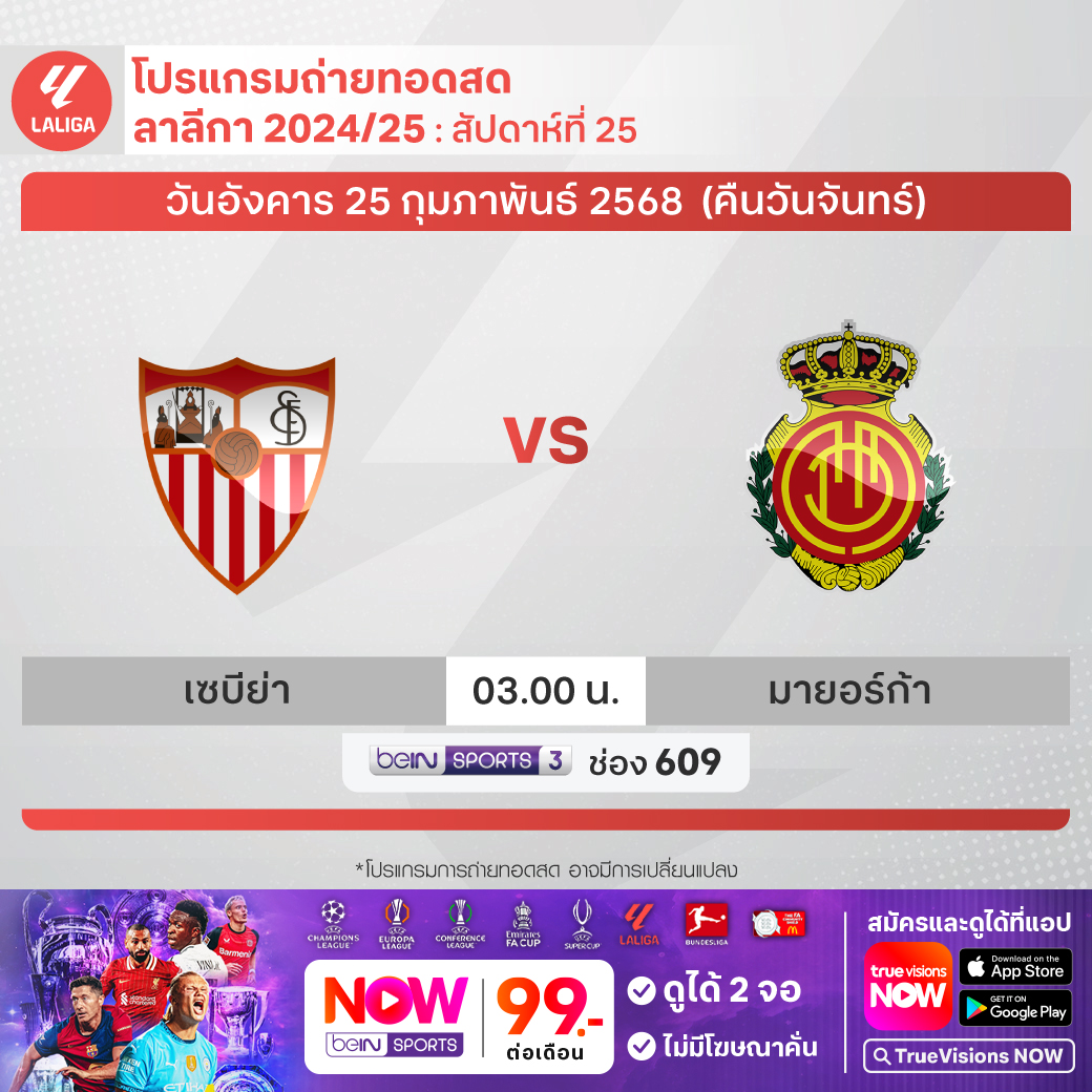 Sevilla vs Mallorca เวลา 03.00-05.00 ทางช่อง beIN 3 (609)