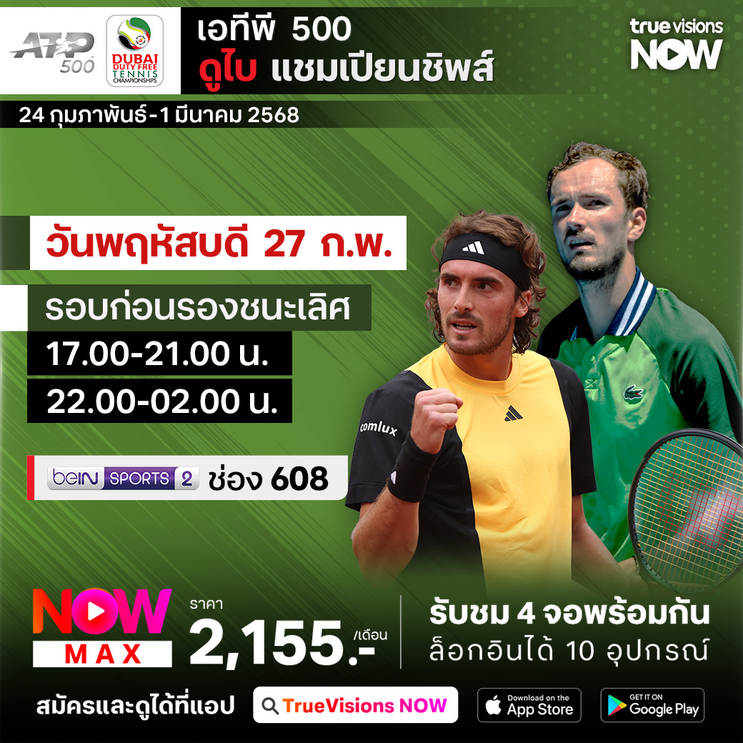 เทนนิส เอทีพี ทัวร์ สัปดาห์นี้ พบกับรายการใหญ่จากภูมิภาคตะวันออกกลางรายการสุดท้ายของปี ดูไบ แชมเปี้ยนชิพส์ ที่เมืองดูไบ สหรัฐอาหรับเอมิเรตส์ รายการนี้รวมดารานักเทนนิสเข้าร่วมการแข่งขันอย่างครบครัน ถือเป็นการเตรียมตัวก่อนเข้าสู่รายการใหญ่ในเดือนมีนาคม ร่วมลุ้นกันว่าใครจะคว้าแชมป์ไปครอง ชมสด ครบทุกรอบ ที่ ทรูวิชั่นส์