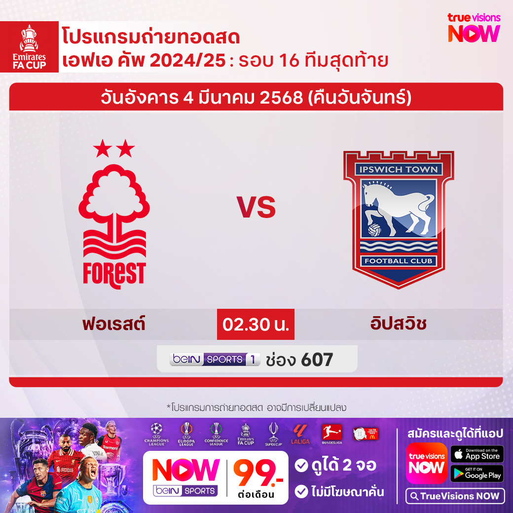 Nottingham Forest vs Ipswich เวลา 02.30-04.30 ทางช่อง beIN 1 (607)