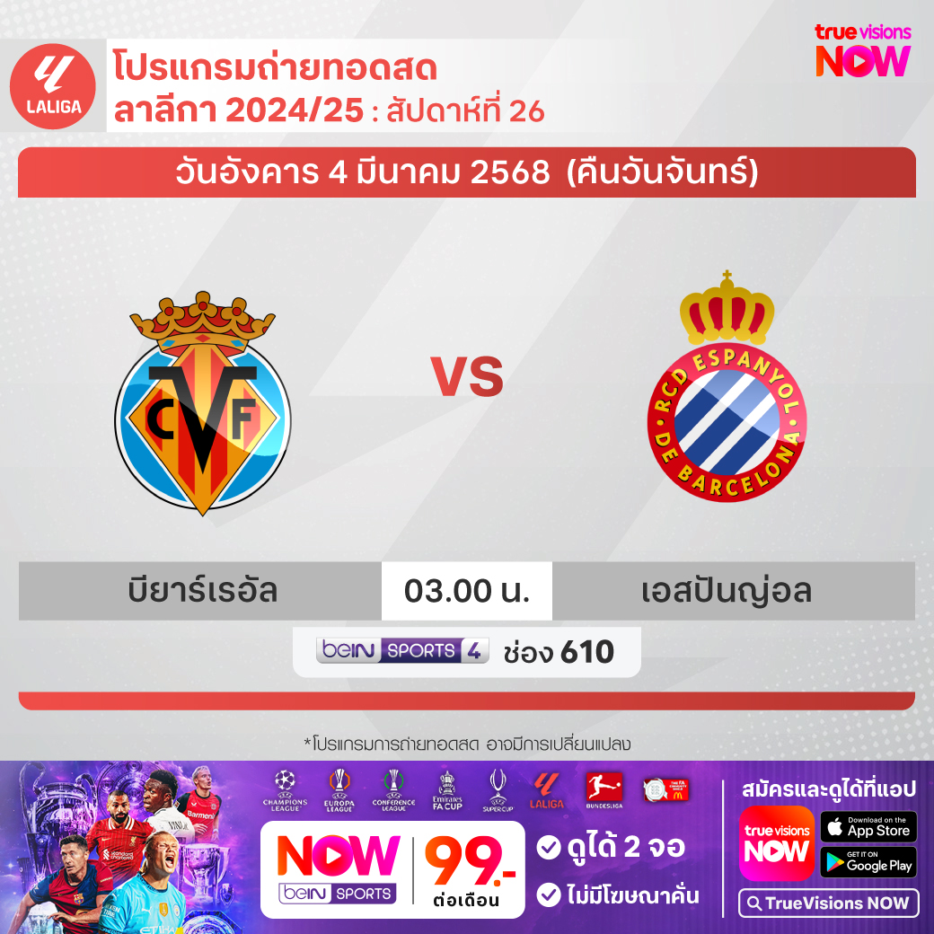 Villarreal vs Espanyol เวลา 03.00-05.00 ทางช่อง beIN 4 (610)