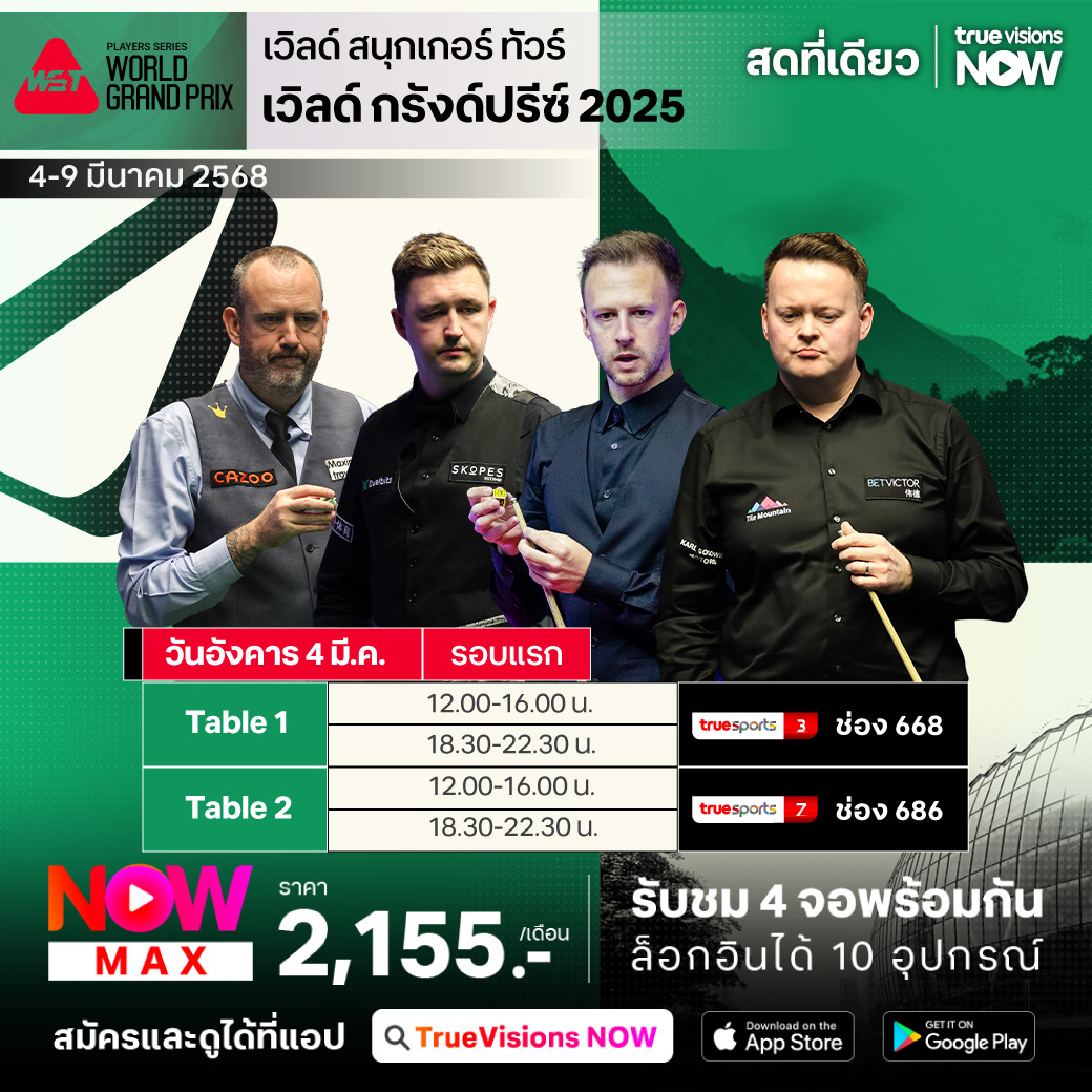 สนุกเกอร์เก็บคะแนนสะสมโลก ฤดูกาล 2025 สัปดาห์นี้ มือระดับท็อปของวงการ โดยเฉพาะ 32 อันดับแรกของโลก ไปรวมตัวกันที่ฮ่องกง เพื่อร่วมแข่งขันรายการ เวิลด์ กรังด์ปรีซ์ ที่เป็นหนึ่งใน เพลย์เยอร์ส ซีรี่ส์ เกมมันๆ แต้มต่อแต้ม เฟรมต่อเฟรม คว้าชัยชนะเพื่อไปต่อ และลุ้นตำแหน่งแชมป์ที่สังเวียน ไคตัก อารีน่า ชมสด เอ็กซ์คลูซีฟ ทุกรอบ ที่เดียวที่ ทรูวิชั่นส์