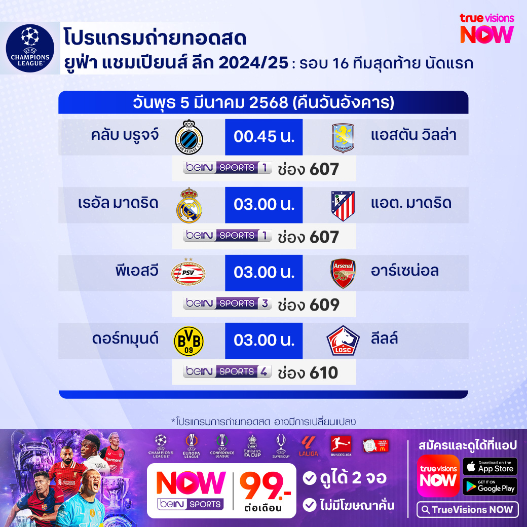 วันนี้มีอะไรดูที่ ทรูวิชั่นส์ ประจำวันอังคารที่ 4 มีนาคม 68 ยังคงมีกีฬาที่น่าสนใจให้ได้ตามลุ้นตามเชียร์กันเหมือนเดิม โดยในส่วนของฟุตบอลนั้นยังมีศึก ยูฟ่า แชมเปี้ยนส์ ลีก รอบ 16 ทีมสุดท้ายนัดแรก ส่วนกีฬาอื่นๆ ยังมี เวิลด์ สนุกเกอร์ ทัวร์ รายการ เวิลด์ กรังด์ปรีซ์ งานนี้ ทรูวิชั่นส์ จัดเต็มให้ชมกันถึงบ้าน