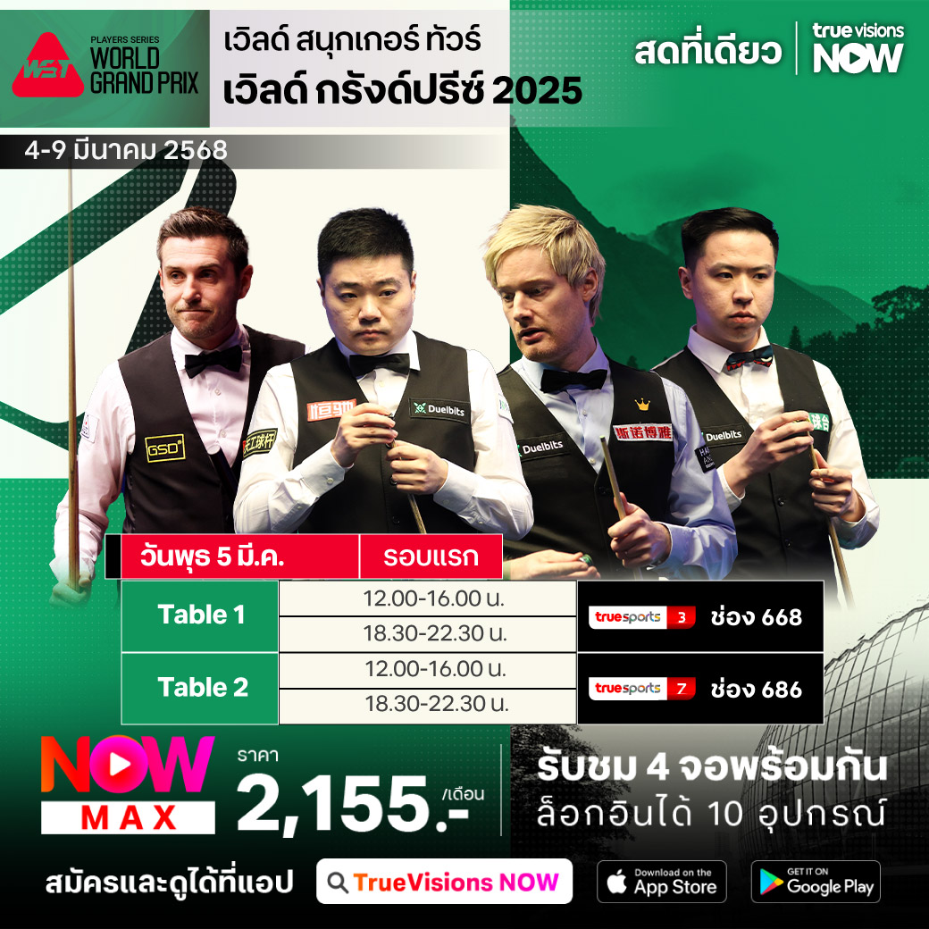 สนุกเกอร์เก็บคะแนนสะสมโลก ฤดูกาล 2025 สัปดาห์นี้ มือระดับท็อปของวงการ โดยเฉพาะ 32 อันดับแรกของโลก ไปรวมตัวกันที่ฮ่องกง เพื่อร่วมแข่งขันรายการ เวิลด์ กรังด์ปรีซ์ ที่เป็นหนึ่งใน เพลย์เยอร์ส ซีรี่ส์ เกมมันๆ แต้มต่อแต้ม เฟรมต่อเฟรม คว้าชัยชนะเพื่อไปต่อ และลุ้นตำแหน่งแชมป์ที่สังเวียน ไคตัก อารีน่า ชมสด เอ็กซ์คลูซีฟ ทุกรอบ ที่เดียวที่ ทรูวิชั่นส์