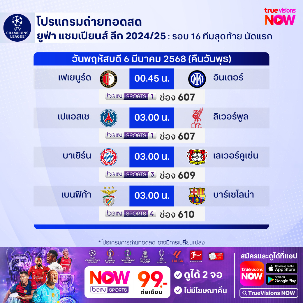 Feyenoord vs Inter เวลา 00.45-02.45 ทางช่อง beIN 1 (607)