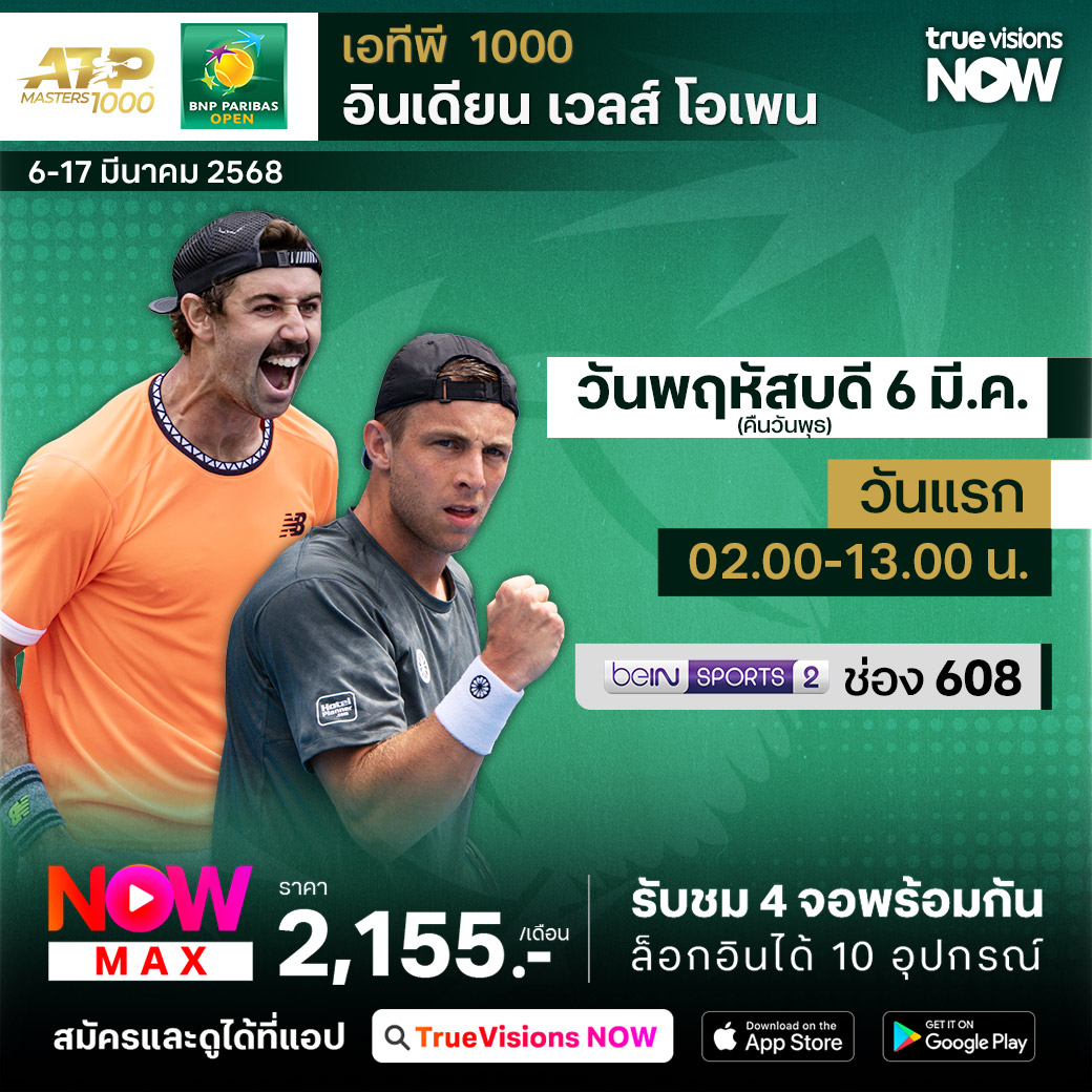 เทนนิส เอทีพี ทัวร์ สัปดาห์นี้ พบกับรายการใหญ่ที่ได้รับการขนานนามว่าเป็นแกรนด์สแลมที่ 5 ของปี อินเดียน เวลส์ โอเพ่น เป็นรายการที่รวมนักกีฬาเทนนิสชื่อดังเข้าร่วมมากที่สุดและมีเงินรางวัลมากที่สุดรายการหนึ่ง ร่วมลุ้นกันว่าใครจะคว้าแชมป์ไปครอง ชมสด ครบทุกรอบ ที่ ทรูวิชั่นส์