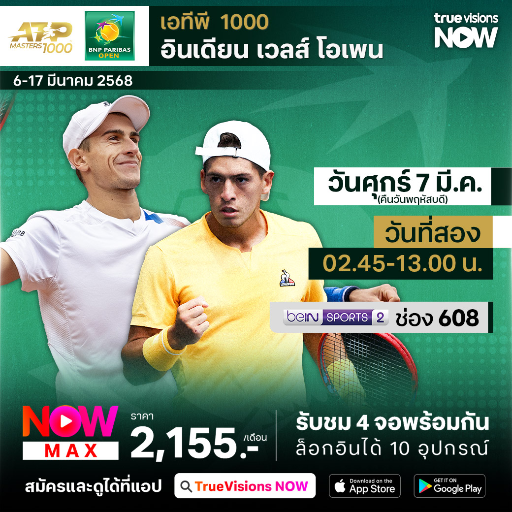 เทนนิส เอทีพี ทัวร์ สัปดาห์นี้ พบกับรายการใหญ่ที่ได้รับการขนานนามว่าเป็นแกรนด์สแลมที่ 5 ของปี อินเดียน เวลส์ โอเพ่น เป็นรายการที่รวมนักกีฬาเทนนิสชื่อดังเข้าร่วมมากที่สุดและมีเงินรางวัลมากที่สุดรายการหนึ่ง ร่วมลุ้นกันว่าใครจะคว้าแชมป์ไปครอง ชมสด ครบทุกรอบ ที่ ทรูวิชั่นส์