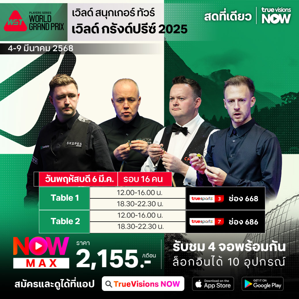 สนุกเกอร์เก็บคะแนนสะสมโลก ฤดูกาล 2025 สัปดาห์นี้ มือระดับท็อปของวงการ โดยเฉพาะ 32 อันดับแรกของโลก ไปรวมตัวกันที่ฮ่องกง เพื่อร่วมแข่งขันรายการ เวิลด์ กรังด์ปรีซ์ ที่เป็นหนึ่งใน เพลย์เยอร์ส ซีรี่ส์ เกมมันๆ แต้มต่อแต้ม เฟรมต่อเฟรม คว้าชัยชนะเพื่อไปต่อ และลุ้นตำแหน่งแชมป์ที่สังเวียน ไคตัก อารีน่า ชมสด เอ็กซ์คลูซีฟ ทุกรอบ ที่เดียวที่ ทรูวิชั่นส์