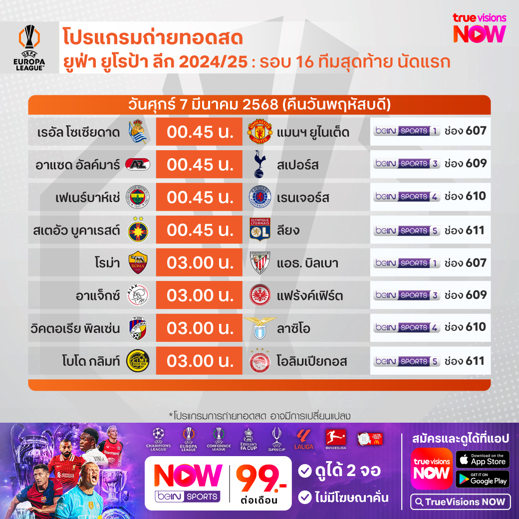 วันนี้มีอะไรดูที่ ทรูวิชั่นส์ ประจำวันพฤหัสบดีที่ 6 มีนาคม 68 ยังคงมีกีฬาที่น่าสนใจให้ได้ตามลุ้นตามเชียร์กันเหมือนเดิม โดยในส่วนของฟุตบอลนั้นยังมีศึก ยูฟ่า ยูโรป้า ลีก และ ยูฟ่า คอนเฟอเรนซ์ ลีก รอบ 16 ทีมสุดท้ายนัดแรก รวมถึง ซาอุดิ โปร ลีก ให้ได้ตามเชียร์กันต่อ ส่วนกีฬาอื่นๆ ยังมี เทนนิส เอทีพี ทัวร์ รายการ อินเดียน เวลส์ โอเพ่น, กอล์ฟ พีจีเอ ทัวร์ รายการ อาร์โนลด์ พาลเมอร์ อินวิเตชั่นแนล, แอลพีจีเอ ทัวร์ รายการ บลู เบย์ แอลพีจีเอ และ เวิลด์ สนุกเกอร์ ทัวร์ รายการ เวิลด์ กรังด์ปรีซ์ งานนี้ ทรูวิชั่นส์ จัดเต็มให้ชมกันถึงบ้าน