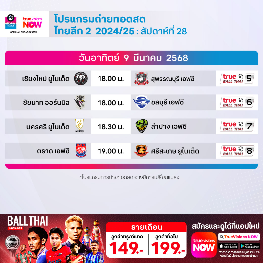 ตราด เอฟซี พบ ศรีสะเกษ ยูไนเต็ด เวลา 19.00-21.00 ทางช่อง True Ball Thai 8