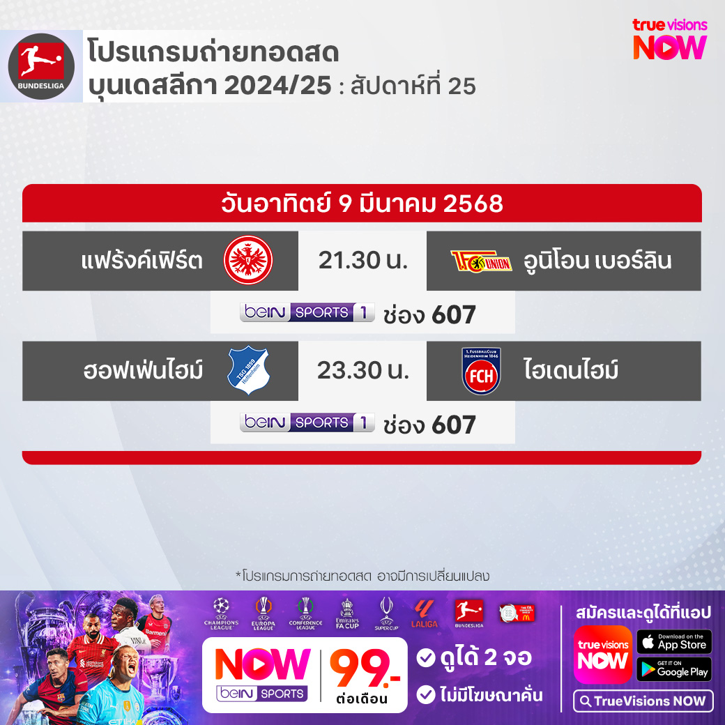 Hoffenheim vs Heidenheim เวลา 23.30-01.30 ทางช่อง beIN 1 (607)