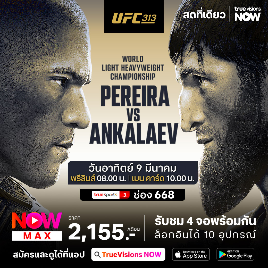 ศึกยูเอฟซี 313 คู่เอก อเล็กซ์ เปเฮร่า แชมเปี้ยนรุ่นไลต์เฮฟวี่เวตจอมแกร่งจากบราซิล ป้องกันตำแหน่งกับผู้ท้าชิงสุดอันตรายจากรัสเซีย มาโกเม็ด อัลคาลาเยฟ รองแชมป์อันดับ 1 ร่วมด้วยคู่สำคัญรุ่นไลต์เวต จัสติน เกทจี้ นักสู้ชาวอเมริกัน รองแชมป์อันดับ 3 พบ แดน ฮุ้กเกอร์ นักสู้ขาลุยจากนิวซีแลนด์ ชมสด เอ็กซ์คลูซีฟ จุใจ ตั้งแต่ช่วงพรีลิมส์จนถึงรอบเมน คาร์ด ที่เดียวที่ ทรูวิชั่นส์