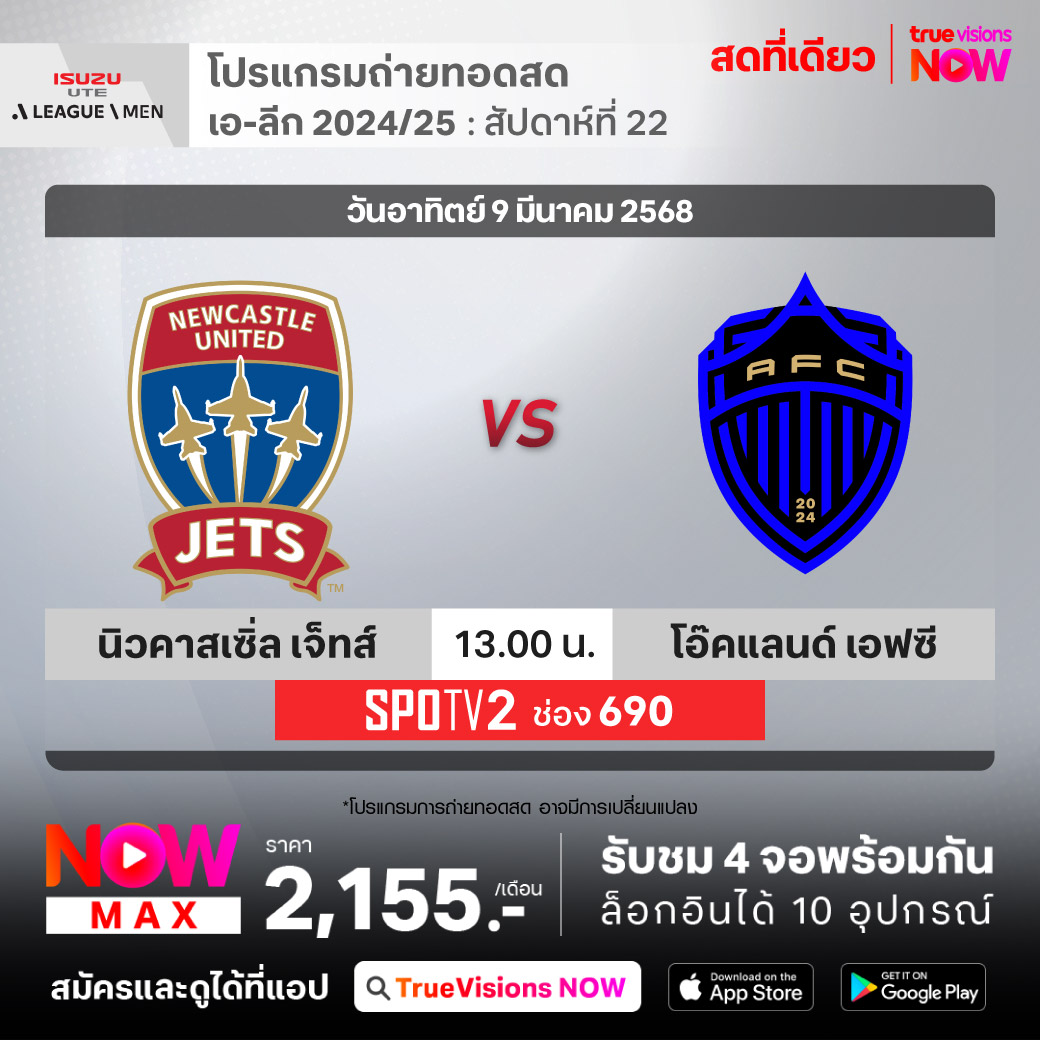 Newcastle Jets vs Auckland FC เวลา 13.00-15.00 ทางช่อง SPOTV2 (690)
