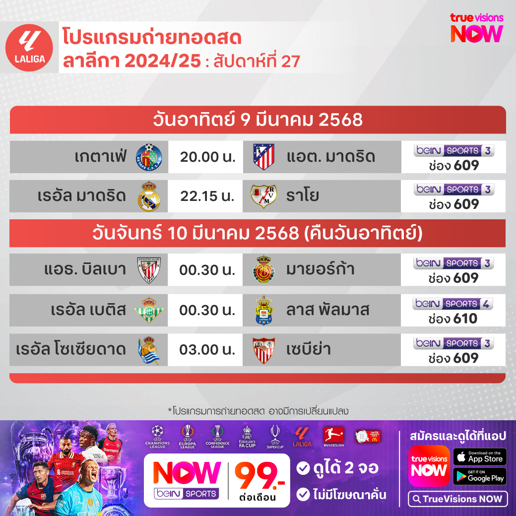 Real Betis vs Las Palmas เวลา 00.30-02.30 ทางช่อง beIN 4 (610)