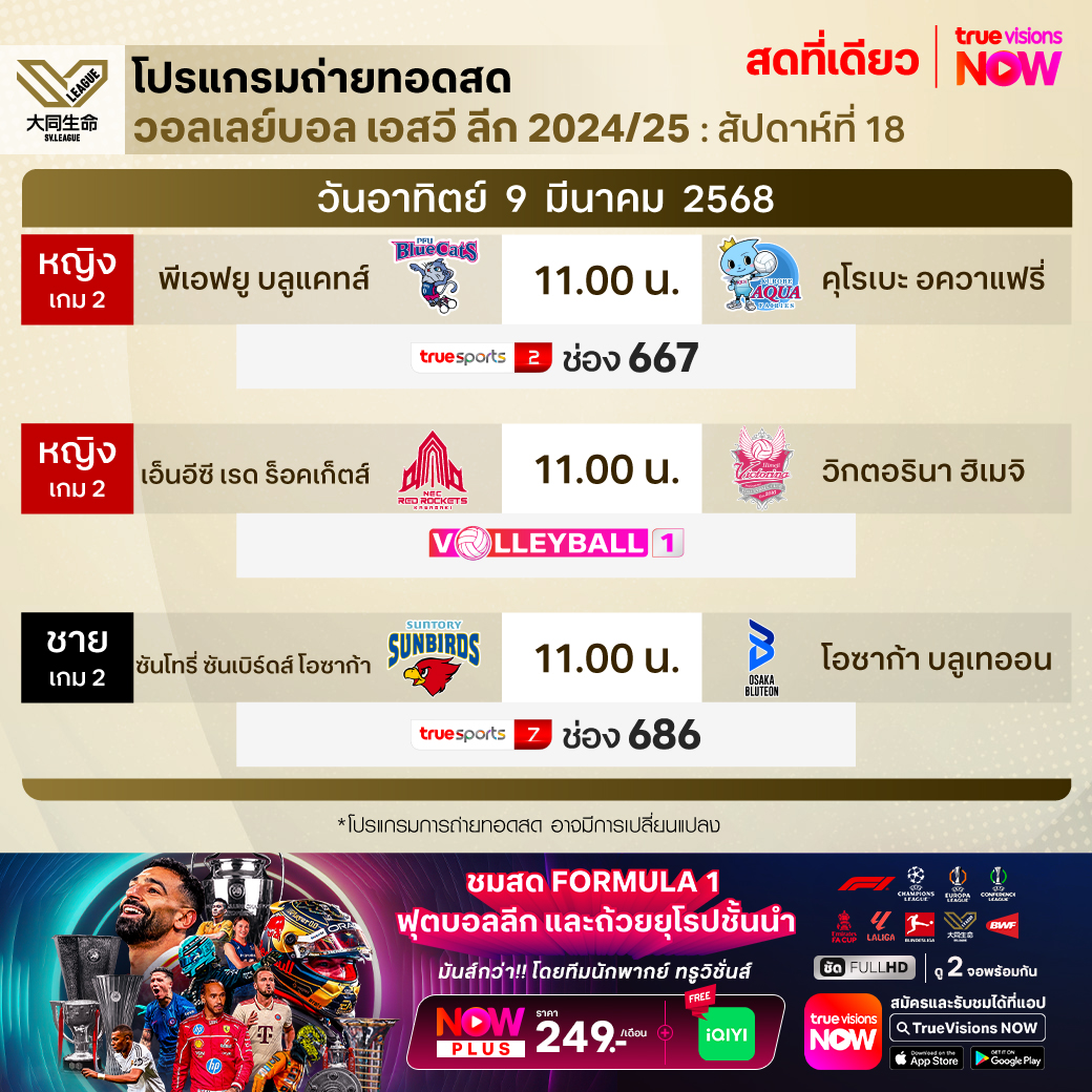 พีเอฟยู บลูแคทส์ พบ คุโรเบะ อควาแฟรี่ เวลา 11.00 - 13.30 ทางช่อง TS2