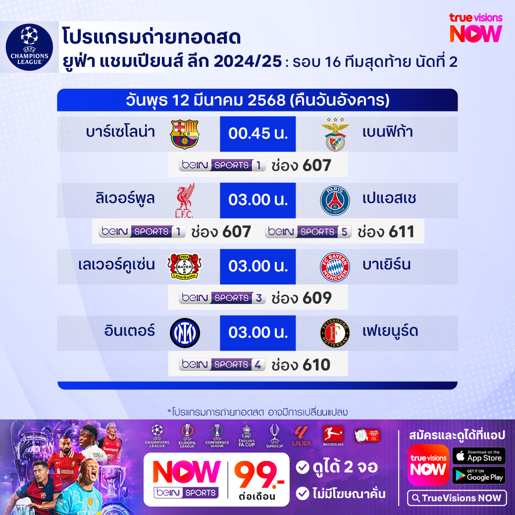 วันนี้มีอะไรดูที่ ทรูวิชั่นส์ ประจำวันอังคารที่ 11 มีนาคม 68 ยังคงมีกีฬาที่น่าสนใจให้ได้ตามลุ้นตามเชียร์กันเหมือนเดิม โดยในส่วนของฟุตบอลนั้นยังมีศึก ยูฟ่า แชมเปี้ยนส์ ลีก รอบ 16 ทีมสุดท้าย นัดที่สอง ให้ได้ตามเชียร์กันต่อ ส่วนกีฬาอื่นๆ ยังมี เทนนิส เอทีพี ทัวร์ และ ดับเบิ้ลยูทีเอ ทัวร์ รายการ อินเดียน เวลส์ โอเพ่น รวมถึง แบดมินตัน บีดับเบิ้ลยูเอฟ รายการ ออล อิงแลนด์ แบดมินตัน แชมเปี้ยนชิพ งานนี้ ทรูวิชั่นส์ จัดเต็มให้ชมกันถึงบ้าน