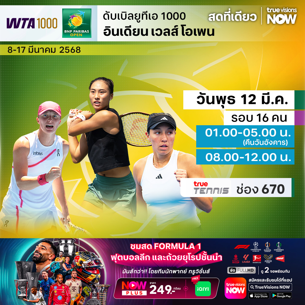 เทนนิส ดับเบิ้ลยูทีเอ ทัวร์ สัปดาห์นี้ พบกับรายการใหญ่ที่ได้รับการขนานนามว่าเป็นแกรนด์สแลมที่ 5 ของปี อินเดียน เวลส์ โอเพ่น เป็นรายการที่รวมนักกีฬาเทนนิสชื่อดังเข้าร่วมมากที่สุดและมีเงินรางวัลมากที่สุดรายการหนึ่ง ร่วมลุ้นกันว่าใครจะคว้าแชมป์ไปครอง ชมสด ครบทุกรอบ ที่ ทรูวิชั่นส์