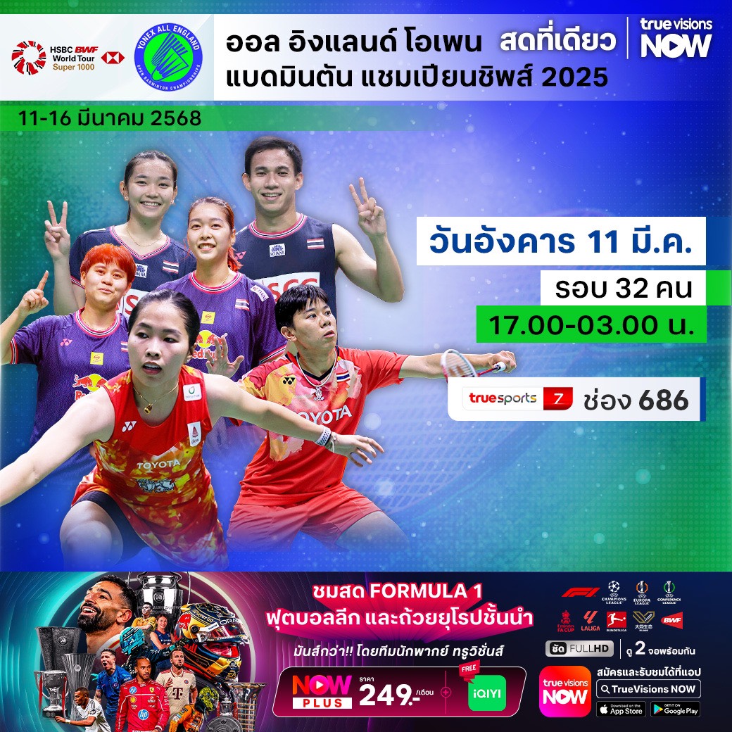 คอกีฬาแบดมินตัน สัปดาห์นี้ต้องไม่พลาดรายการสุดยิ่งใหญ่และสุดคลาสสิกตลอดกาลอย่าง ออล อิงแลนด์ แบดมินตัน แชมเปี้ยนชิพ 2025 ที่เมืองเบอร์มิงแฮม ประเทศอังกฤษ ส่งใจเชียร์นักแบดมินตันไทยชุดใหญ่ สู้กับเหล่าซูเปอร์สตาร์ของโลก และลุ้นกันว่าใครจะเป็นแชมป์ในปีนี้ ชมสด เอ็กซ์คลูซีฟ จุใจ ครบทุกรอบ ที่เดียวที่ ทรูวิชั่นส์