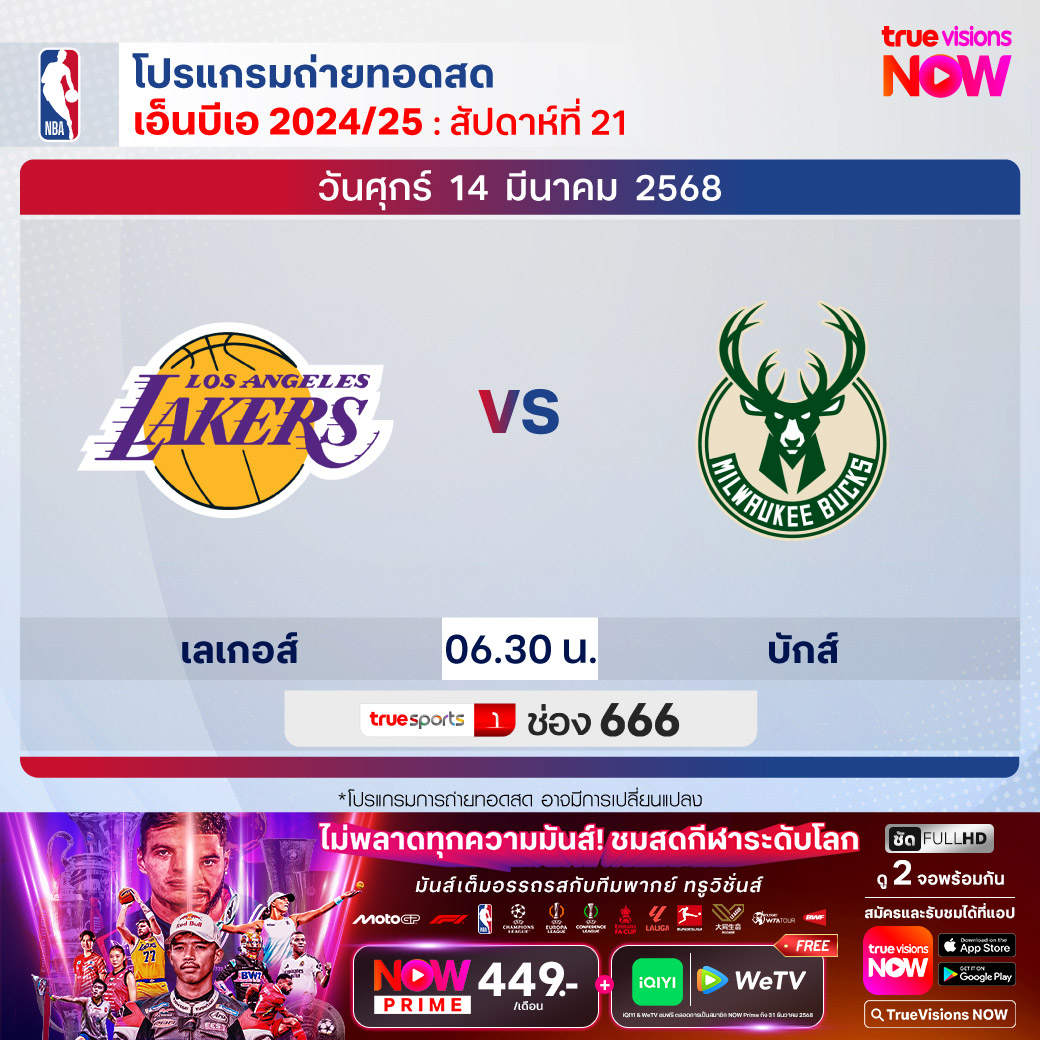 วันศุกร์ 14 มี.ค. Lakers Vs Bucks เวลา 06.30 ทางช่อง TS 1 (666)