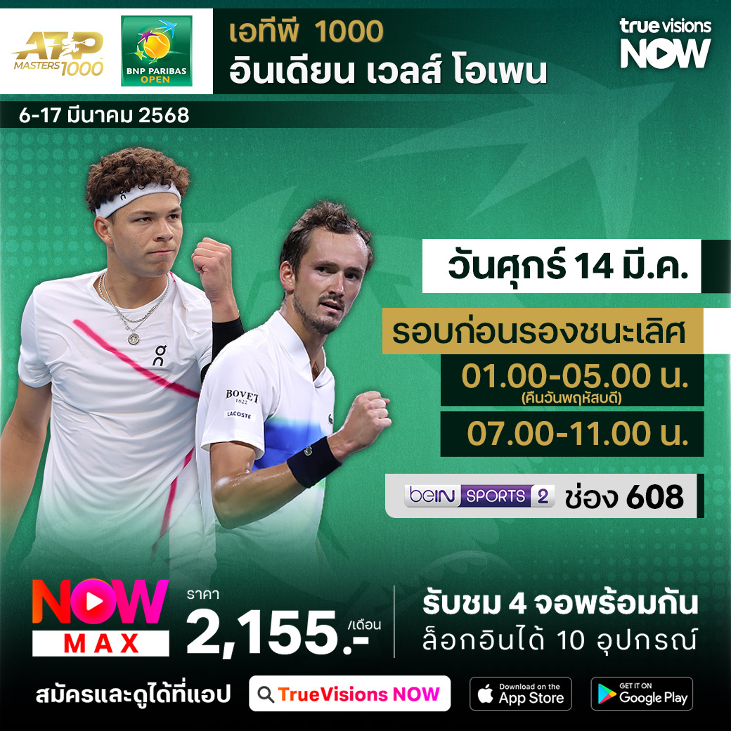 เทนนิส เอทีพี ทัวร์ สัปดาห์นี้ พบกับรายการใหญ่ที่ได้รับการขนานนามว่าเป็นแกรนด์สแลมที่ 5 ของปี อินเดียน เวลส์ โอเพ่น เป็นรายการที่รวมนักกีฬาเทนนิสชื่อดังเข้าร่วมมากที่สุดและมีเงินรางวัลมากที่สุดรายการหนึ่ง ร่วมลุ้นกันว่าใครจะคว้าแชมป์ไปครอง ชมสด ครบทุกรอบ ที่ ทรูวิชั่นส์