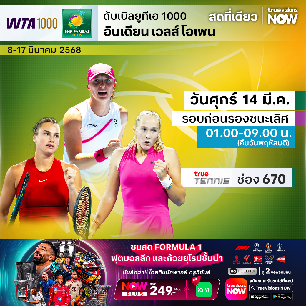 เทนนิส ดับเบิ้ลยูทีเอ ทัวร์ สัปดาห์นี้ พบกับรายการใหญ่ที่ได้รับการขนานนามว่าเป็นแกรนด์สแลมที่ 5 ของปี อินเดียน เวลส์ โอเพ่น เป็นรายการที่รวมนักกีฬาเทนนิสชื่อดังเข้าร่วมมากที่สุดและมีเงินรางวัลมากที่สุดรายการหนึ่ง ร่วมลุ้นกันว่าใครจะคว้าแชมป์ไปครอง ชมสด ครบทุกรอบ ที่ ทรูวิชั่นส์