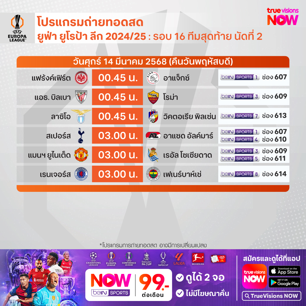 วันนี้มีอะไรดูที่ ทรูวิชั่นส์ ประจำวันพฤหัสบดีที่ 13 มีนาคม 68 ยังคงมีกีฬาที่น่าสนใจให้ได้ตามลุ้นตามเชียร์กันเหมือนเดิม โดยในส่วนของฟุตบอลนั้นยังมีศึก ยูฟ่า ยูโรป้า ลีก และ ยูฟ่า คอนเฟอเรนซ์ ลีก รอบ 16 ทีมสุดท้าย นัดที่สอง และ ซาอุดิ โปร ลีก ให้ได้ตามเชียร์กันต่อ ส่วนกีฬาอื่นๆ ยังมี เทนนิส เอทีพี ทัวร์ และ ดับเบิ้ลยูทีเอ ทัวร์ รายการ อินเดียน เวลส์ โอเพ่น, กอล์ฟ พีจีเอ ทัวร์ รายการ เดอะ เพลเยอร์ส แชมเปี้ยนชิพ, เคแอลพีจีเอ ทัวร์ รายการ บลู แคนยอน เลดี้ส์ แชมเปี้ยนชิพ รวมถึง แบดมินตัน บีดับเบิ้ลยูเอฟ รายการ ออล อิงแลนด์ แบดมินตัน แชมเปี้ยนชิพ และ บาสเกตบอลเอ็นบีเอ งานนี้ ทรูวิชั่นส์ จัดเต็มให้ชมกันถึงบ้าน