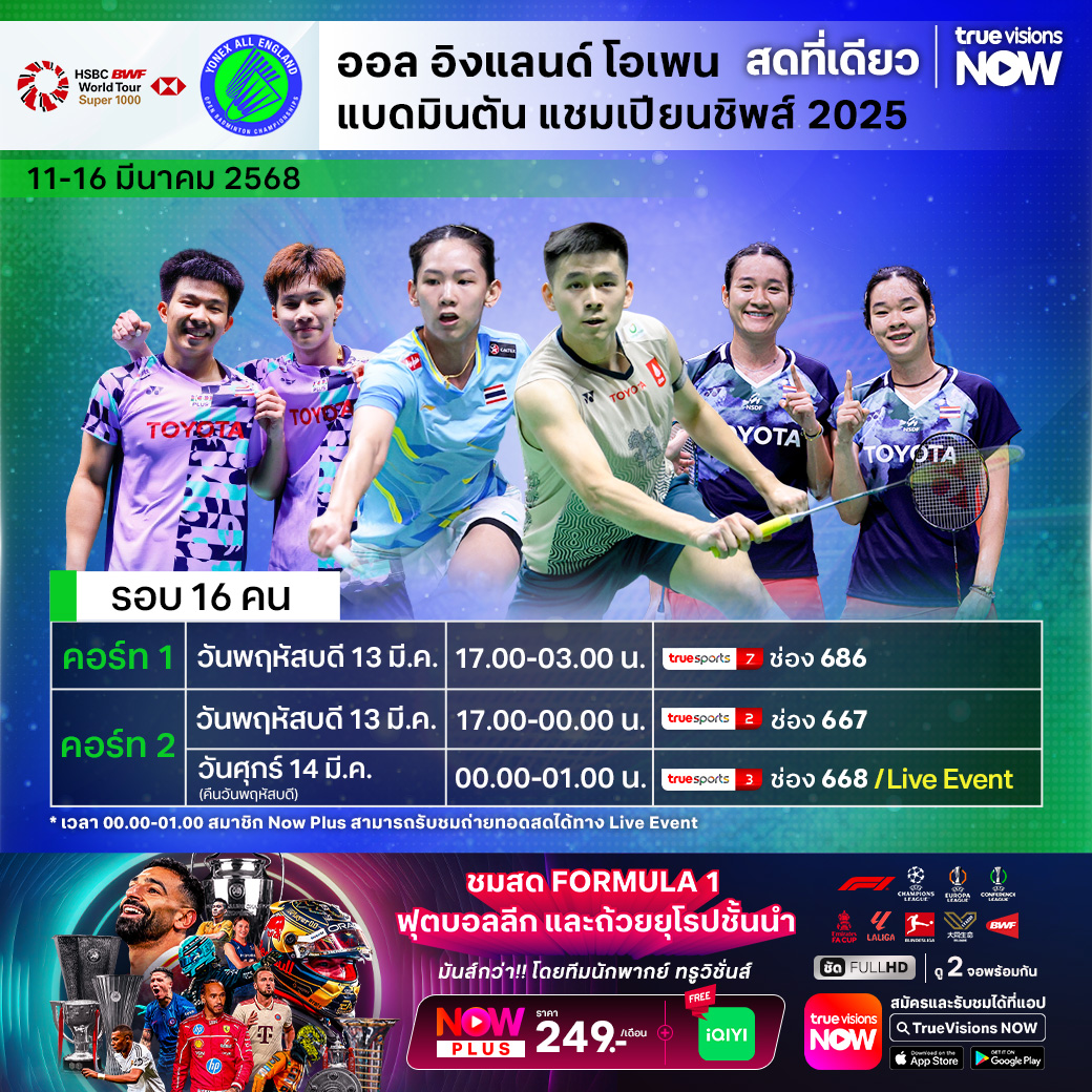 คอกีฬาแบดมินตัน สัปดาห์นี้ต้องไม่พลาดรายการสุดยิ่งใหญ่และสุดคลาสสิกตลอดกาลอย่าง ออล อิงแลนด์ แบดมินตัน แชมเปี้ยนชิพ 2025 ที่เมืองเบอร์มิงแฮม ประเทศอังกฤษ ส่งใจเชียร์นักแบดมินตันไทยชุดใหญ่ สู้กับเหล่าซูเปอร์สตาร์ของโลก และลุ้นกันว่าใครจะเป็นแชมป์ในปีนี้ ชมสด เอ็กซ์คลูซีฟ จุใจ ครบทุกรอบ ที่เดียวที่ ทรูวิชั่นส์