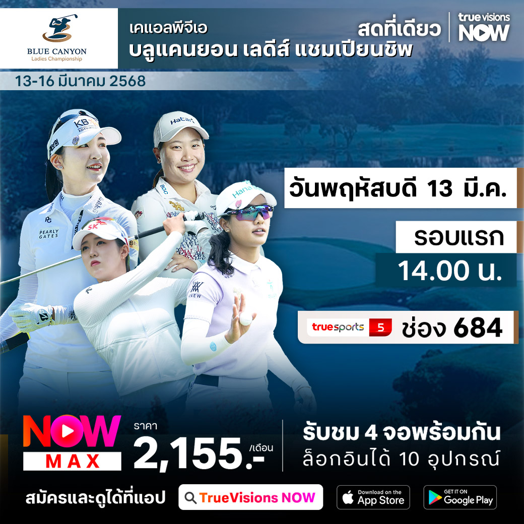 กอล์ฟหญิงรายการสำคัญที่เกิดขึ้นในประเทศไทยเป็นครั้งที่ 2 กับการแข่งขันรายการระดับโลก เคแอลพีจีเอ บลู แคนยอน เลดี้ส์ แชมเปี้ยนชิพ 2025 จาก สนาม บลู แคนย่อน คันทรี่ คลับ จังหวัดภูเก็ต ทัพใหญ่ของโปรสาวจาก เคแอลพีจีเอ ของเกาหลีใต้ บุกมาโชว์ผลงานและลุ้นแชมป์ร่วมกับโปรสาวไทยในฐานะเจ้าถิ่น โดยมีเงินรางวัลรวมให้ชิงกันมากถึง 800,000 เหรียญสหรัฐฯ หรือประมาณ 27 ล้านบาท ชมสด เอ็กซ์คลูซีฟ ที่เดียวที่ ทรูวิชั่นส์