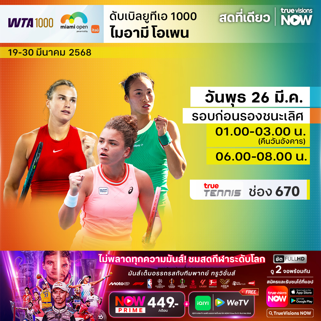 เทนนิสหญิง ดับเบิ้ลยูทีเอ ทัวร์ รายการใหญ่ ส่งท้ายช่วง Sunshine Double กับรายการ ไมอามี่ โอเพ่น จากเมืองไมอามี่ รัฐฟลอริดา ประเทศสหรัฐอเมริกา บรรดานักเทนนิสสาวมือระดับท็อป พากันเข้าร่วมแข่งขันแบบจัดเต็ม ร่วมลุ้นกันว่าใครจะคว้าแชมป์รายการนี้ไปครอง ชมสด ครบทุกรอบ ที่ ทรูวิชั่นส์