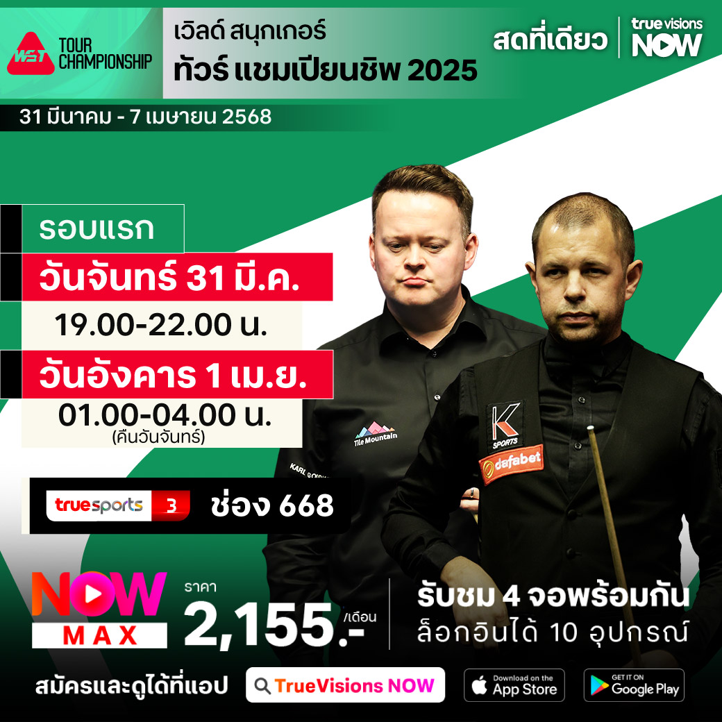เข้มข้นสุดๆ สำหรับ เวิลด์ สนุกเกอร์ ทัวร์ ที่เดินทางมาถึงรายการรองสุดท้ายของฤดูกาล กับศึก ทัวร์ แชมเปี้ยนชิพ 2025 ที่จะปิดท้ายเพลย์เยอร์ส ซีรี่ส์ จับตาดู 12 มือพระกาฬของโลก นำโดย จั๊ดด์ ทรัมป์ มือ 1 ของโลก และ ไคเรน วิลสัน แชมป์โลกคนล่าสุด ออกคิวเพื่อพิชิตคู่แข่งและคว้าชัยชนะ เพื่อเข้าไปลุ้นตำแหน่งแชมป์อันทรงเกียรติ ชมสด เอ็กซ์คลูซีฟ ครบทุกรอบ ที่เดียวที่ ทรูวิชั่นส์