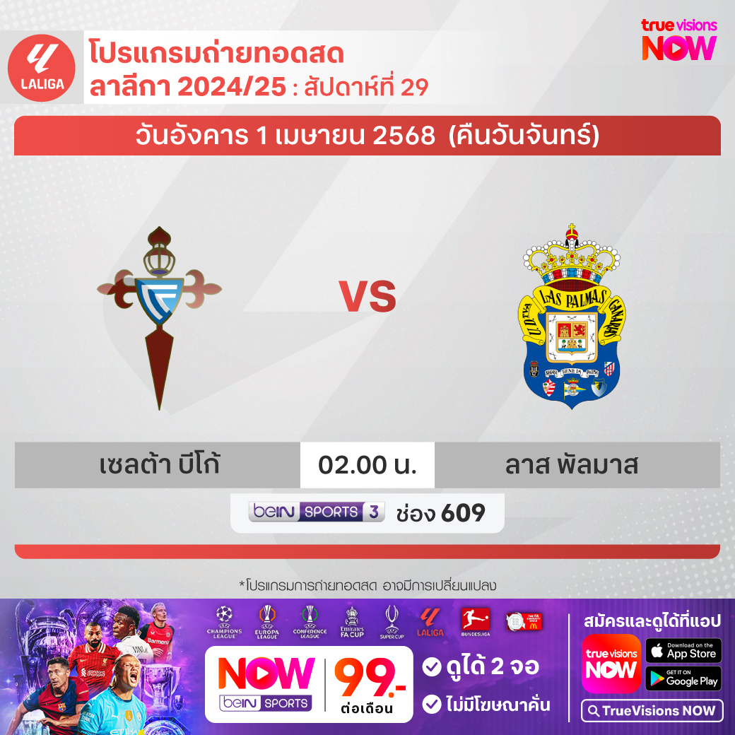 Celta Vigo vs Las Palmas เวลา 02.00-04.00 ทางช่อง beIN 3 (609)