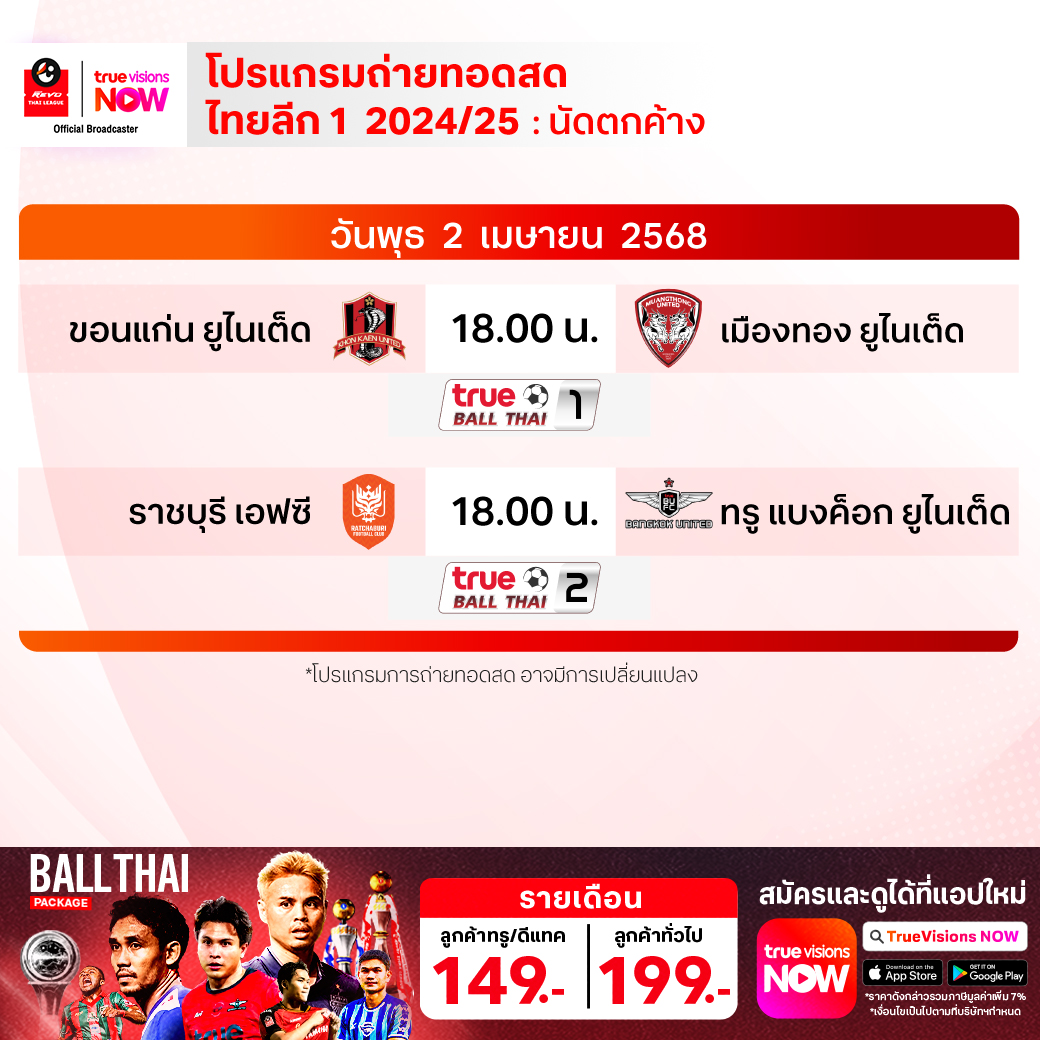 ขอนแก่น ยูไนเต็ด พบ เมืองทอง ยูไนเต็ด เวลา 18.00-20.00 ทางช่อง True Ball Thai 1