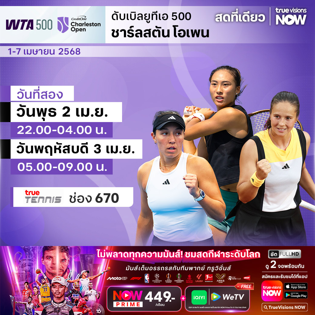 เทนนิสหญิง ดับเบิ้ลยูทีเอ ทัวร์ สัปดาห์นี้เข้าสู่ช่วงการแข่งขันบนคอร์ทดินอย่างเป็นทางการ กับรายการ ชาร์ลสตัน โอเพ่น จากเมืองชาร์ลสตัน รัฐเซาท์ แคโรไลน่า ประเทศสหรัฐอเมริกา ซึ่งรายการนี้จะเป็นรายการที่ให้นักเทนนิสหญิงได้ปรับตัวจากการแข่งขันบนฮาร์ทคอร์ทสู่การแข่งขันบนคอร์ทดินที่จะยาวนานไปอีกหลายเดือน ร่วมลุ้นกันว่าใครจะคว้าแชมป์รายการนี้ไปครอง ชมสด ครบทุกรอบ ที่ ทรูวิชั่นส์