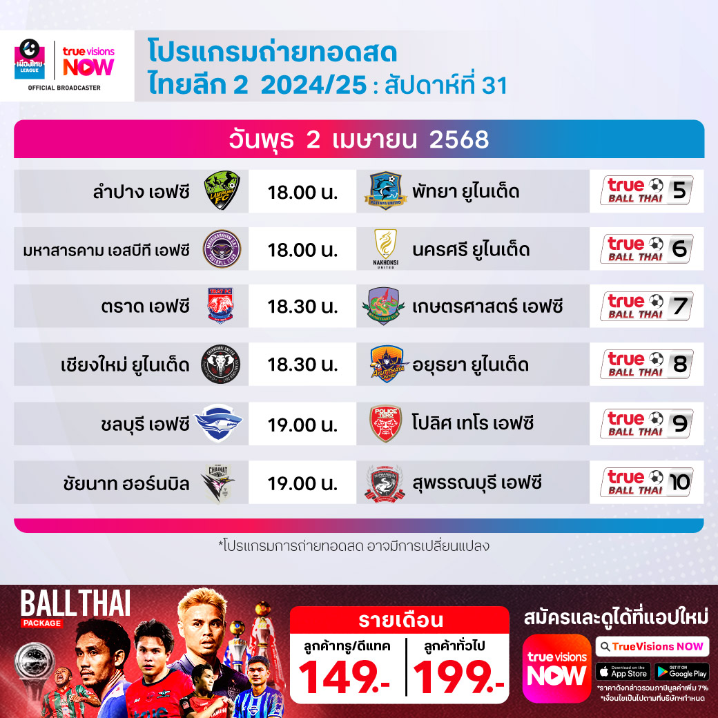 เชียงใหม่ ยูไนเต็ด พบ อยุธยา ยูไนเต็ด เวลา 18.30-20.30 ทางช่อง True Ball Thai 8