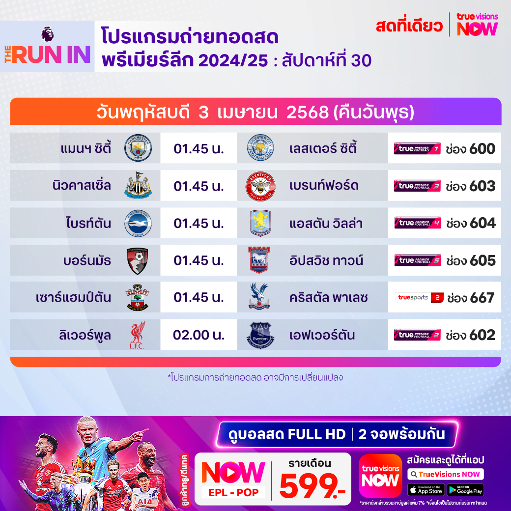 Man City vs Leicester City เวลา 01:45 - 03:45 ทางช่องTPF 1(600)