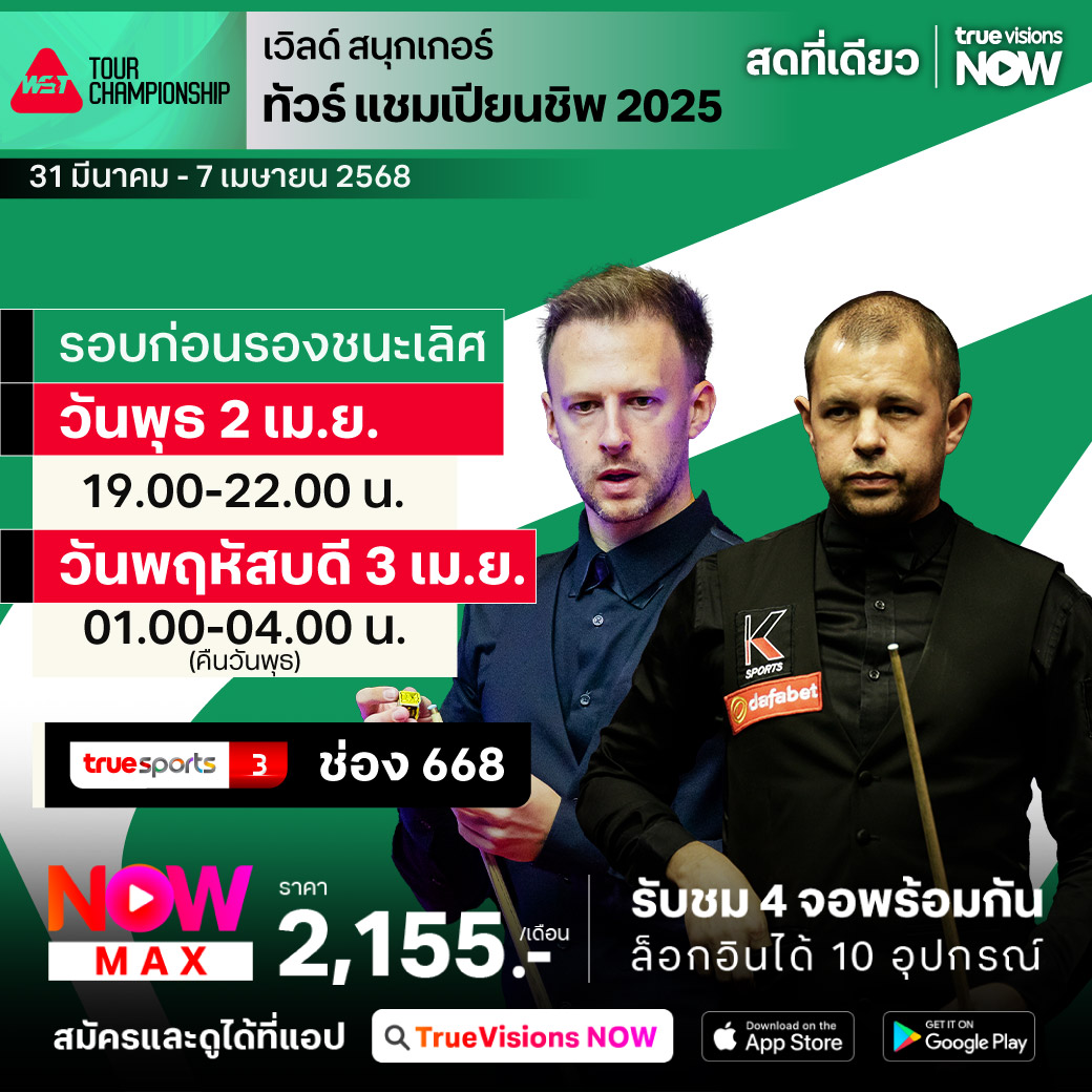 เข้มข้นสุดๆ สำหรับ เวิลด์ สนุกเกอร์ ทัวร์ ที่เดินทางมาถึงรายการรองสุดท้ายของฤดูกาล กับศึก ทัวร์ แชมเปี้ยนชิพ 2025 ที่จะปิดท้ายเพลย์เยอร์ส ซีรี่ส์ จับตาดู 12 มือพระกาฬของโลก นำโดย จั๊ดด์ ทรัมป์ มือ 1 ของโลก และ ไคเรน วิลสัน แชมป์โลกคนล่าสุด ออกคิวเพื่อพิชิตคู่แข่งและคว้าชัยชนะ เพื่อเข้าไปลุ้นตำแหน่งแชมป์อันทรงเกียรติ ชมสด เอ็กซ์คลูซีฟ ครบทุกรอบ ที่เดียวที่ ทรูวิชั่นส์