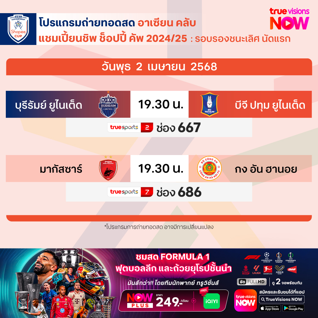 วันนี้มีอะไรดูที่ ทรูวิชั่นส์ ประจำวันพุธที่ 2 เมษายน 68 ยังคงมีกีฬาที่น่าสนใจให้ได้ตามลุ้นตามเชียร์กันเหมือนเดิม โดยในส่วนของฟุตบอลนั้นยังมีศึกพรีเมียร์ลีก อังกฤษ, อาเซียน คลับ แชมเปี้ยนชิพ ช็อปปี้ คัพ, ซาอุดิ คิงส์ คัพ และ ไทยลีก 1, 2 ให้ได้ตามเชียร์กันต่อ ส่วนกีฬาอื่นๆ ยังมี เทนนิส ดับเบิ้ลยูทีเอ ทัวร์ รายการ ชาร์ลสตัน โอเพ่น, กอล์ฟ แอลพีจีเอ ทัวร์ รายการ ที-โมบาย แมตช์ เพลย์ และ เวิลด์ สนุกเกอร์ ทัวร์ รายการ ทัวร์ แชมเปี้ยนชิพ 2025 งานนี้ ทรูวิชั่นส์ จัดเต็มให้ชมกันถึงบ้าน