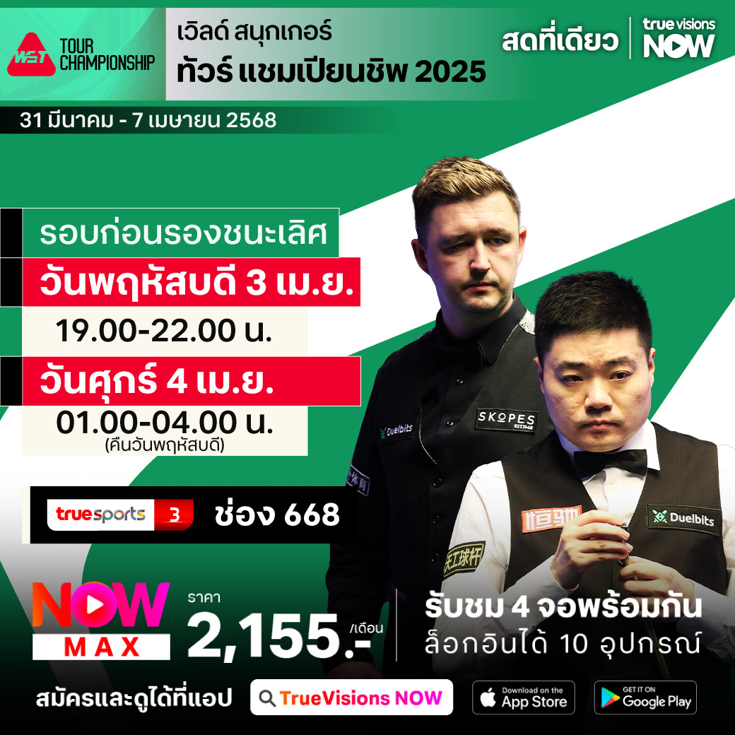 เข้มข้นสุดๆ สำหรับ เวิลด์ สนุกเกอร์ ทัวร์ ที่เดินทางมาถึงรายการรองสุดท้ายของฤดูกาล กับศึก ทัวร์ แชมเปี้ยนชิพ 2025 ที่จะปิดท้ายเพลย์เยอร์ส ซีรี่ส์ จับตาดู 12 มือพระกาฬของโลก นำโดย จั๊ดด์ ทรัมป์ มือ 1 ของโลก และ ไคเรน วิลสัน แชมป์โลกคนล่าสุด ออกคิวเพื่อพิชิตคู่แข่งและคว้าชัยชนะ เพื่อเข้าไปลุ้นตำแหน่งแชมป์อันทรงเกียรติ ชมสด เอ็กซ์คลูซีฟ ครบทุกรอบ ที่เดียวที่ ทรูวิชั่นส์