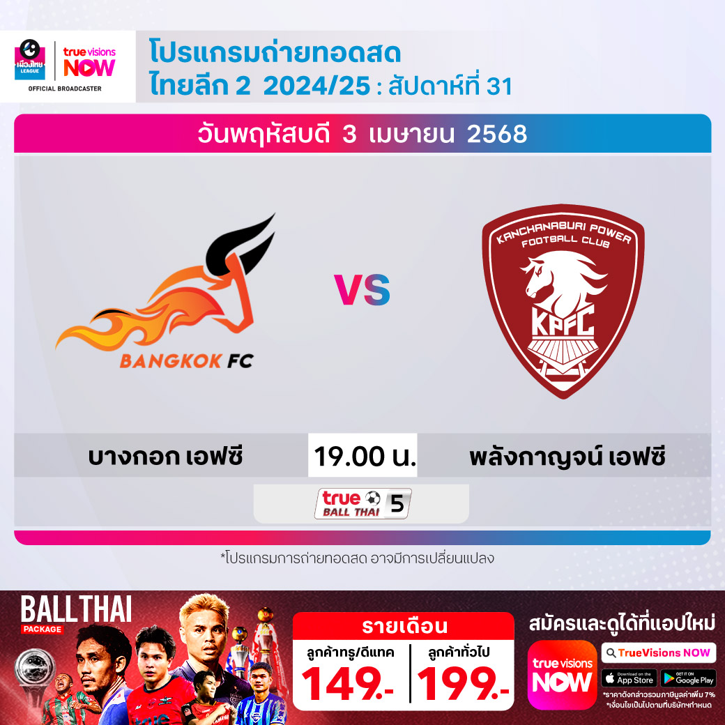 บางกอก เอฟซี พบ พลังกาญจน์ เอฟซี เวลา 19.00-21.00 ทางช่อง True Ball Thai 5