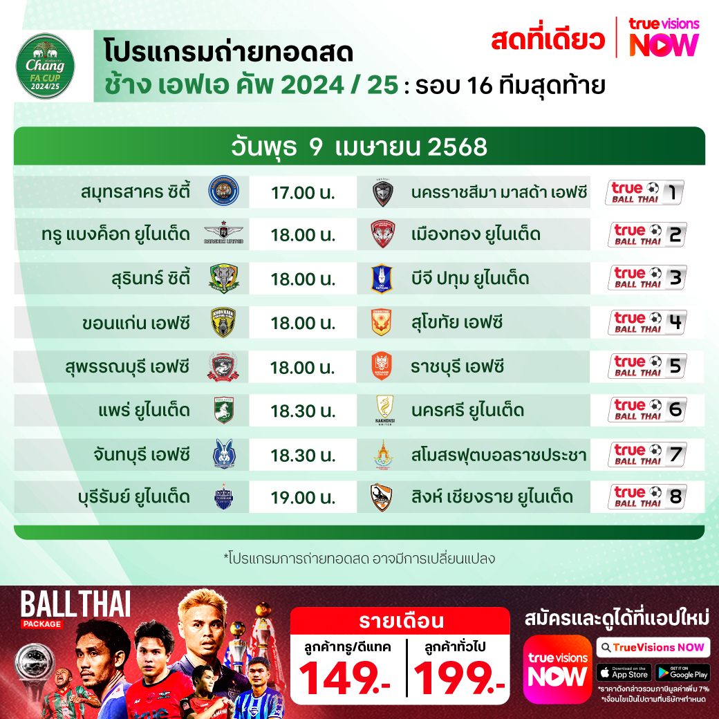 จันทบุรี เอฟซี พบ สโมสรฟุตบอลราชประชา เวลา 18.30-20.30 ทางช่อง True Ball Thai 7