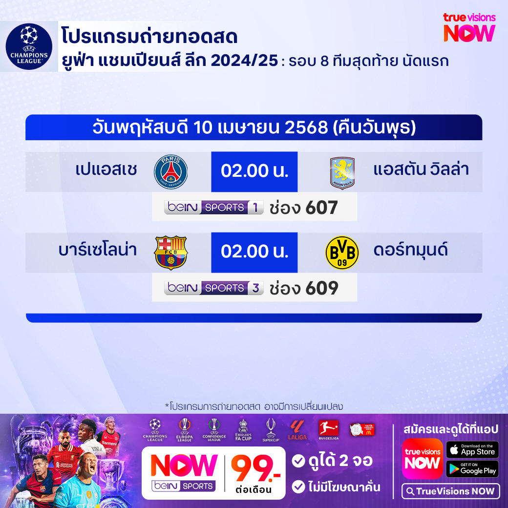 PSG vs Aston Villa เวลา 02.00-04.00 ทางช่อง beIN 1 (607)