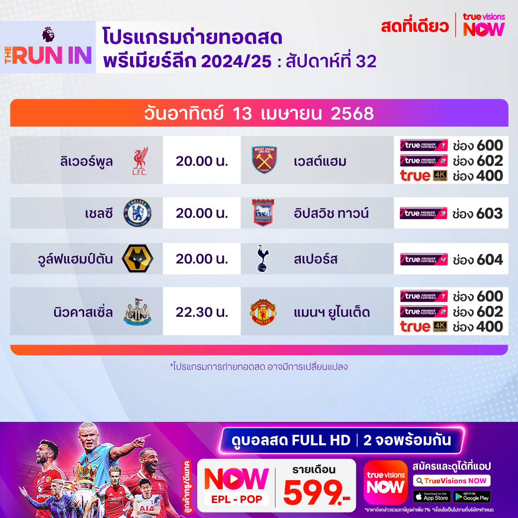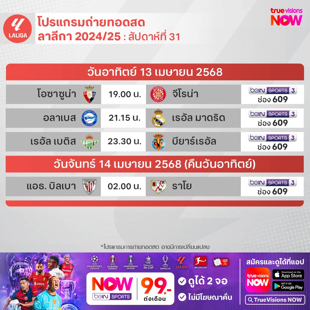 วันนี้มีอะไรดูที่ ทรูวิชั่นส์ ประจำวันอาทิตย์ที่ 13 เมษายน 68 ยังคงมีกีฬาที่น่าสนใจให้ได้ตามลุ้นตามเชียร์กันเหมือนเดิม โดยในส่วนของฟุตบอลนั้นยังมีศึกพรีเมียร์ลีก อังกฤษ, บุนเดสลีกา เยอรมนี, ลา ลีกา สเปน, เมเจอร์ ลีก ซอคเก้อร์, เอ-ลีก ออสเตรเลีย และ ไทยลีก 1 ให้ได้ตามเชียร์กันต่อ ส่วนกีฬาอื่นๆ คอมอเตอร์สปอร์ต พลาดไม่ได้กับศึก ฟอร์มูล่า วัน รายการ บาห์เรน กรังด์ปรีซ์ และ โมโต จีพี รายการ กาตาร์ กรังด์ปรีซ์ นอกเหนือจากนี้ยังมี เทนนิส เอทีพี ทัวร์ รายการ มอนติ-คาร์โล มาสเตอร์ส, กอล์ฟเมเจอร์แรกของปี รายการ เดอะ มาสเตอร์ส ทัวร์นาเมนท์, แบดมินตัน รายการ เอเชีย แชมเปี้ยนชิพส์ และ วอลเลย์บอล เอสวี ลีก งานนี้ ทรูวิชั่นส์ จัดเต็มให้ชมกันถึงบ้าน