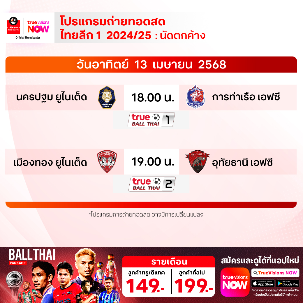 เมืองทอง ยูไนเต็ด พบ อุทัยธานี เอฟซี เวลา 19.00-21.00 ทางช่อง True Ball Thai 2