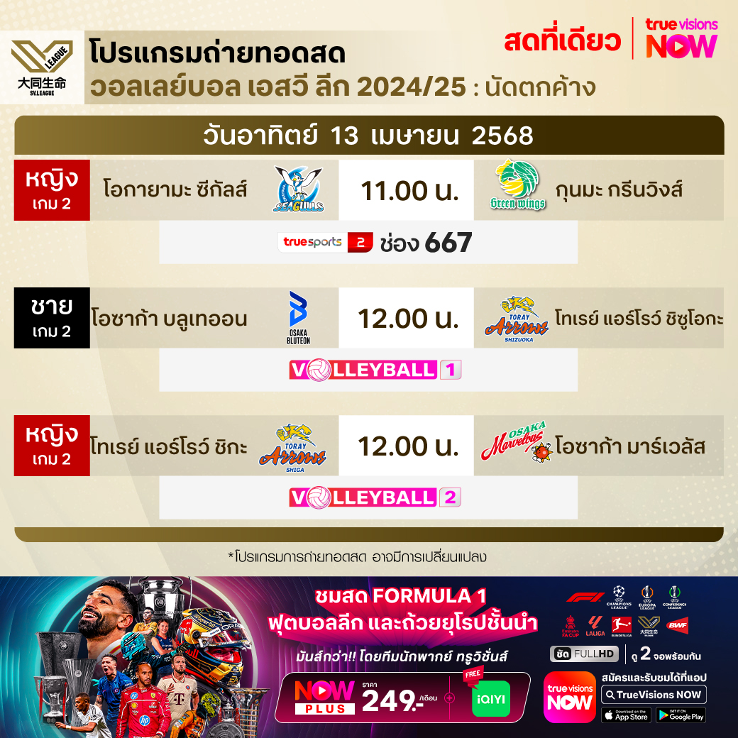โอซาก้า บลูเทออน พบ โทเรย์ แอร์โรว์ ชิซูโอกะ เวลา 12.00 - 14.30 ทางช่อง Volleyball 1