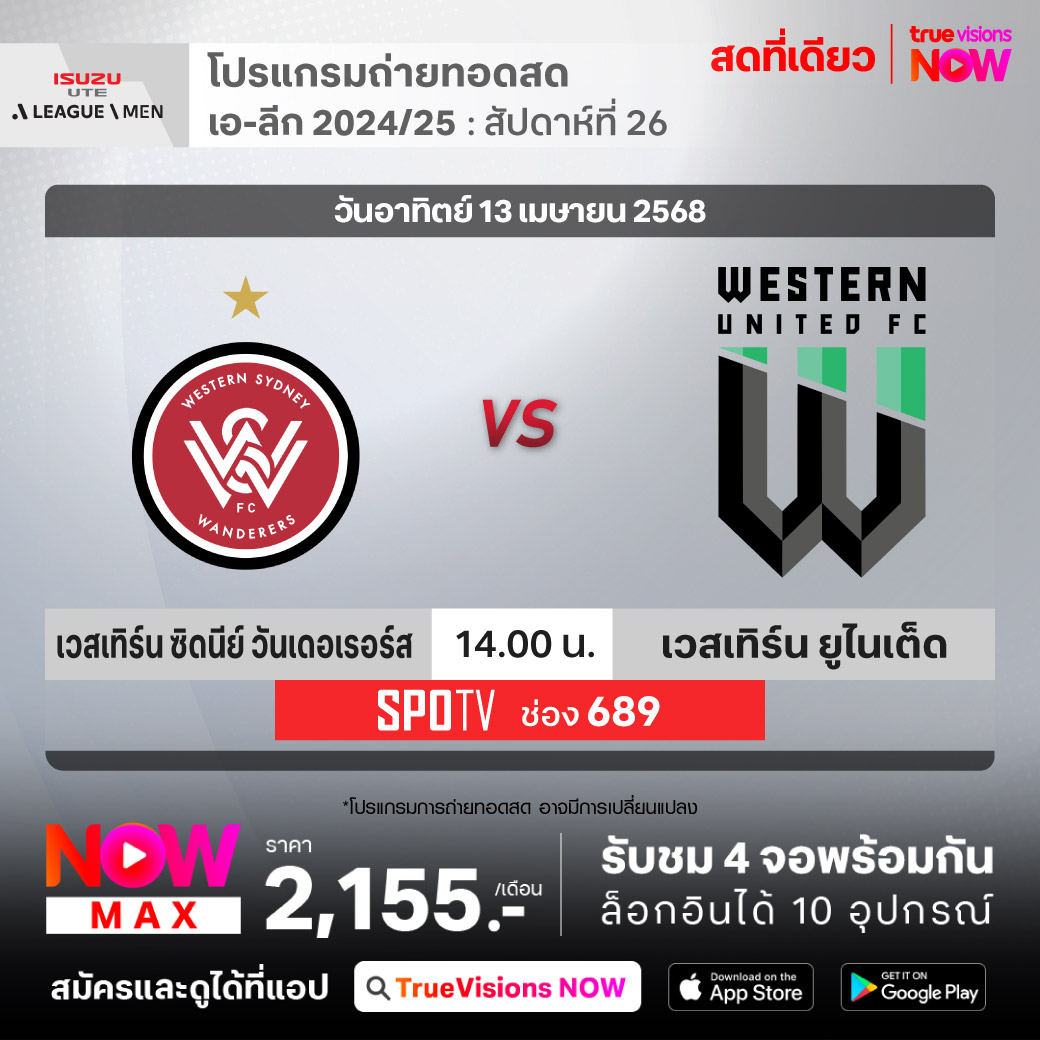 Western Sydney Wanderers vs Western United เวลา 14.00-16.00 ทางช่อง SPOTV (689)