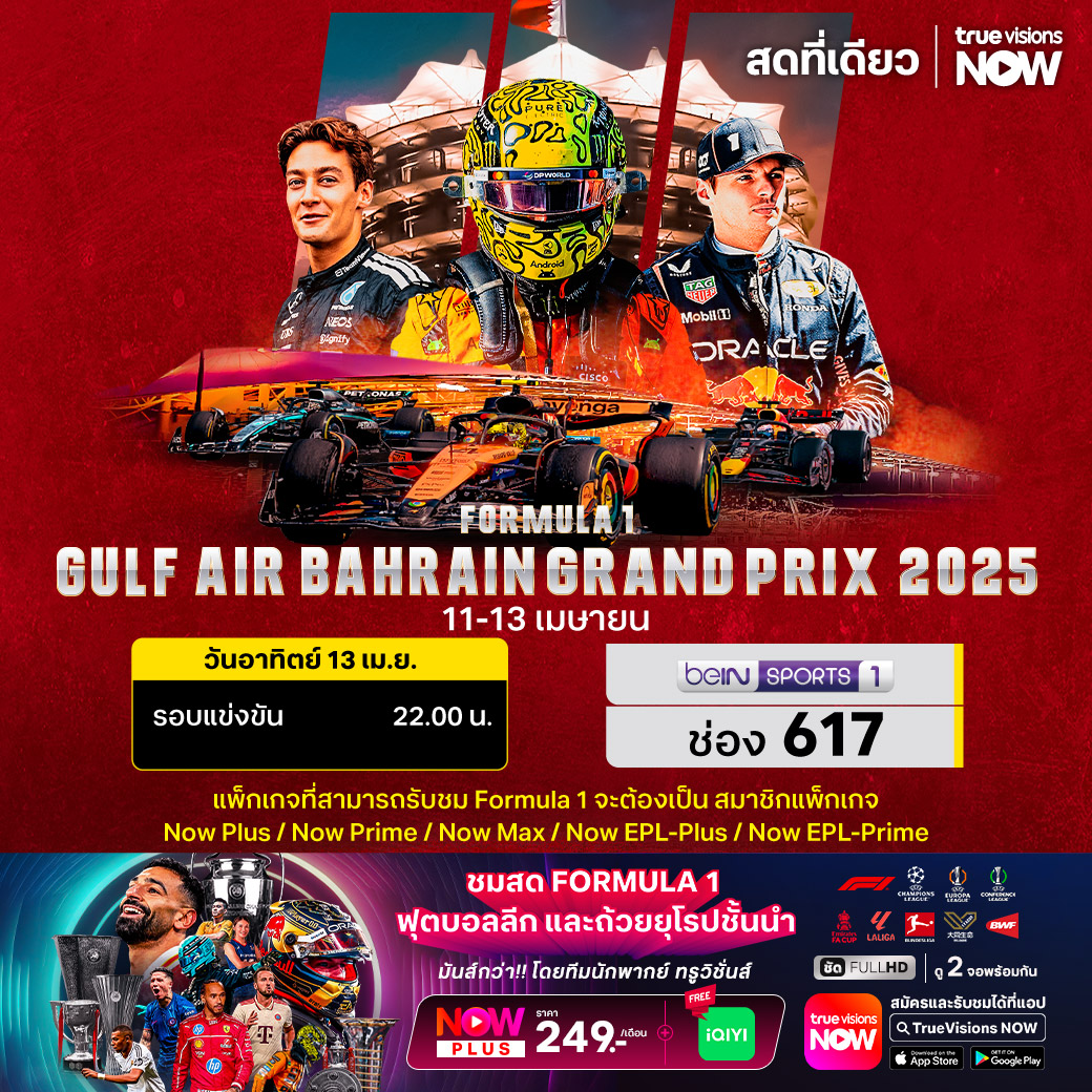 ศึก ฟอร์มูล่า วัน สัปดาห์นี้ จับตาดูการช่วงชิงอันดับและแย่งเก็บคะแนนสะสมอันล้ำค่า ในการแข่งขันสนามที่ 4 บาห์เรน กรังด์ปรีซ์ จากสนามสุดท้าทาย บาห์เรน อินเตอร์เนชั่นแนล เซอร์กิต ร่วมลุ้นกันว่า นักแข่งจากทีมเฟอร์รารี่, เร้ดบูล, แม็คลาเรน หรือ เมอร์ซิเดส ใครจะได้ครอบครองตำแหน่งบนโพเดี้ยม ชมสด เอ็กซ์คลูซีฟ ที่เดียวที่ ทรูวิชั่นส์