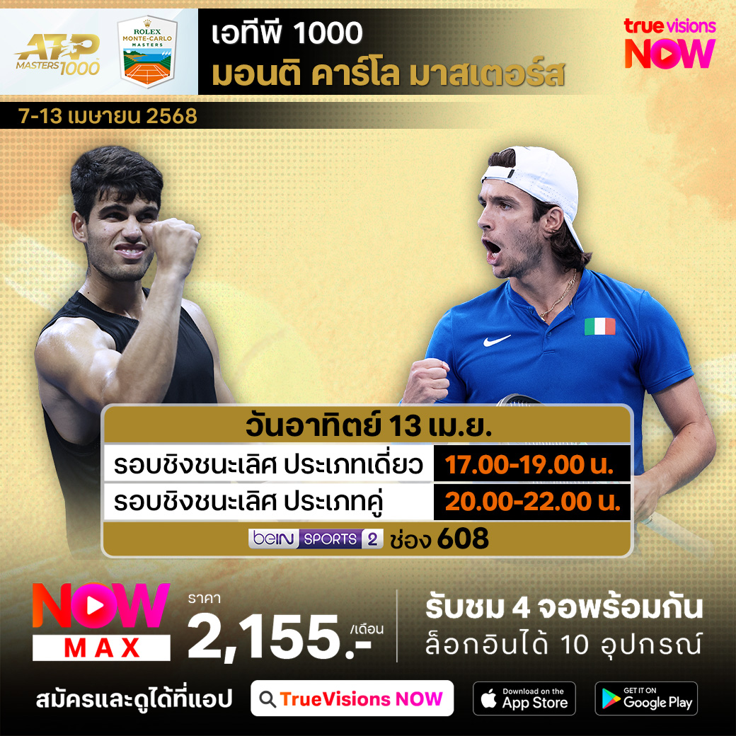 เทนนิส เอทีพี ทัวร์ สัปดาห์นี้พบกับรายการใหญ่ ต้อนรับฤดูกาลแข่งขันเทนนิสคอร์ทดิน กับรายการ มอนติ-คาร์โล มาสเตอร์ส จากราชรัฐโมนาโก รายการที่รวมนักเทนนิสชายมือระดับโลกเข้าร่วมการแข่งขันกันอย่างคับคั่ง ร่วมลุ้นกันว่าใครจะคว้าแชมป์คอร์ทดินรายการใหญ่รายการแรกในปีนี้ไปครอง ชมสด ครบทุกรอบ ที่ ทรูวิชั่นส์