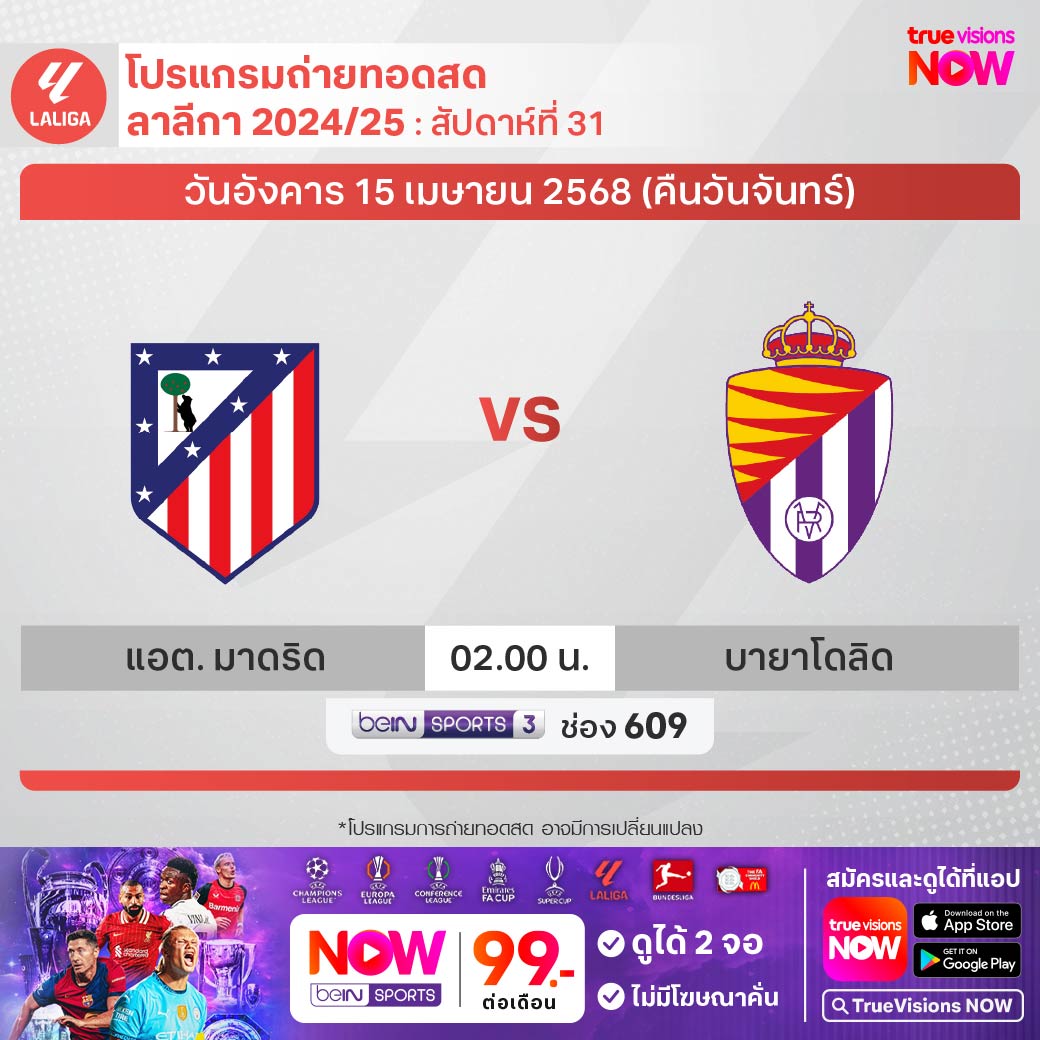 Atletico Madrid vs Valladolid เวลา 02.00-04.00 ทางช่อง beIN 3 (609)