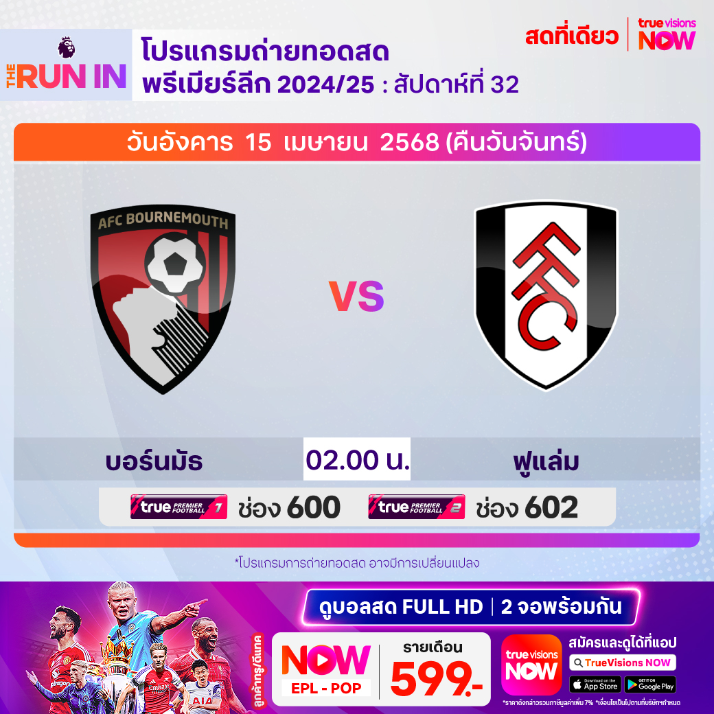 Bournemouth vs Fulham เวลา 02:00 - 04:00 ทางช่อง TPF 1 (600) / TPF 2 (602)