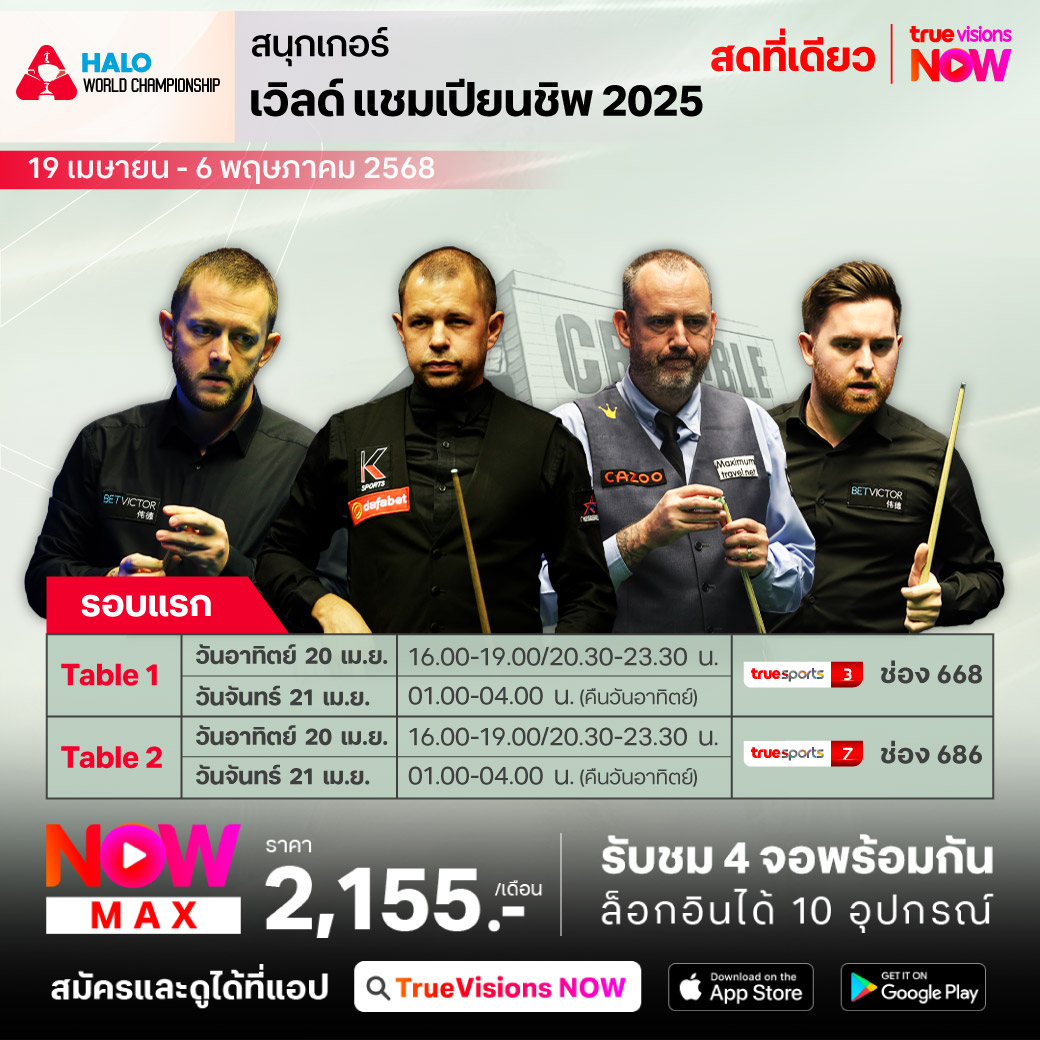 ไม่ต้องรออีกต่อไป เมื่อความยิ่งใหญ่ที่แฟนๆ รอคอยมาถึงแล้ว กับศึก เวิลด์ สนุกเกอร์ ทัวร์ รายกาย เวิลด์ แชมเปี้ยนชิพ หรือสนุกเกอร์ชิงแชมป์โลก รายการที่เก่าแก่และและยิ่งใหญ่ที่สุด เปิดฉากขึ้นแล้วที่สังเวียน ครูซิเบิ้ล เธียเตอร์ อันศักดิ์สิทธิ์ ในเมืองเชฟฟิลด์ ประเทศอังกฤษ ชมเกมสดๆ การันตีครบทุกแมตช์ตลอด 17 วันเต็ม ร่วมลุ้นกันว่าใครจะก้าวขึ้นสู่บัลลังก์แชมป์โลกอันทรงเกียรติในปีนี้ ชมสด เอ็กซ์คลูซีฟ ที่เดียวที่ ทรูวิชั่นส์