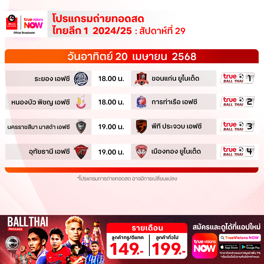 ระยอง เอฟซี พบ ขอนแก่น ยูไนเต็ด เวลา 18.00-20.00 ทางช่อง True Ball Thai 1